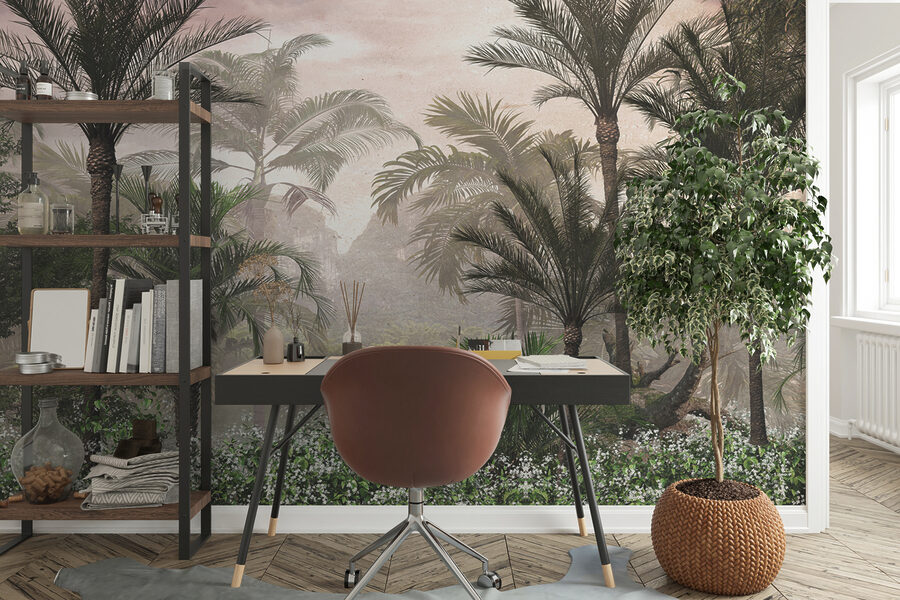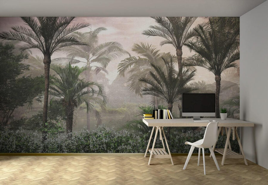 Fototapeta ścienna “Spokojny poranek w tropikalnym raju” – czy ta nazwa nie jest po prostu zachęcająca? Wyobraź sobie, że budzisz się w tej spokojnej scenerii w swoim salonie. Żywe zielenie, delikatne kwiaty i strzeliste palmy otulone delikatną poranną mgiełką. To jak wejście do własnej, prywatnej dżungli bez opuszczania kanapy.