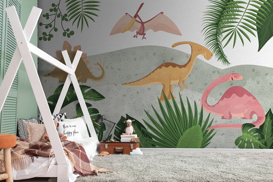 Zmień pokój każdego dziecka w krainę dinozaurów dzięki tej uroczej fototapecie „Grupa dinozaurów z liśćmi”. Wyobraź sobie małych odkrywców patrzących na figlarne roślinożerne dinozaury i zuchwałego latającego pterozaura – ich wyobraźnia zacznie pracować na pełnych obrotach! To coś więcej niż tylko fototapeta – to historia czekająca na ciekawskie umysły. Każdy dinozaur wygląda prawie jak żywy, gotowy do działania. Kojące odcienie zieleni i delikatne pastelowe kolory dodają spokojnej atmosfery, przypominającej mały zakątek prehistorycznego raju. Ta fototapeta to nie tylko dekoracja – to zaproszenie do przygody i odrobina radości w każdym pomieszczeniu. Idealna do pobudzania kreatywności, a bądźmy szczerzy – kto nie chciałby budzić się w towarzystwie przyjaznych dinozaurów?