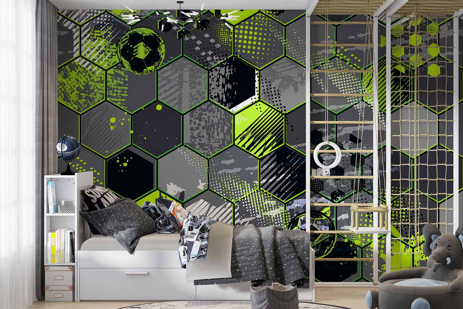 Wzór ma ten zabawny sześciokątny wzór z plamami neonowej zieleni i eleganckiej szarości. To jak zderzenie boiska piłkarskiego ze sztuką nowoczesną. Idealny dla każdego, kto kocha odrobinę zabawy i stylu w swoim wystroju. To nie tylko tapeta – to oświadczenie. Wyobraź to sobie: budzisz się, bierzesz kawę i za każdym razem, gdy przechodzisz obok niej, dostajesz mały zastrzyk szczęścia. Świetny początek rozmowy za każdym razem, gdy znajomi przychodzą i pytają: “Skąd to masz?”.