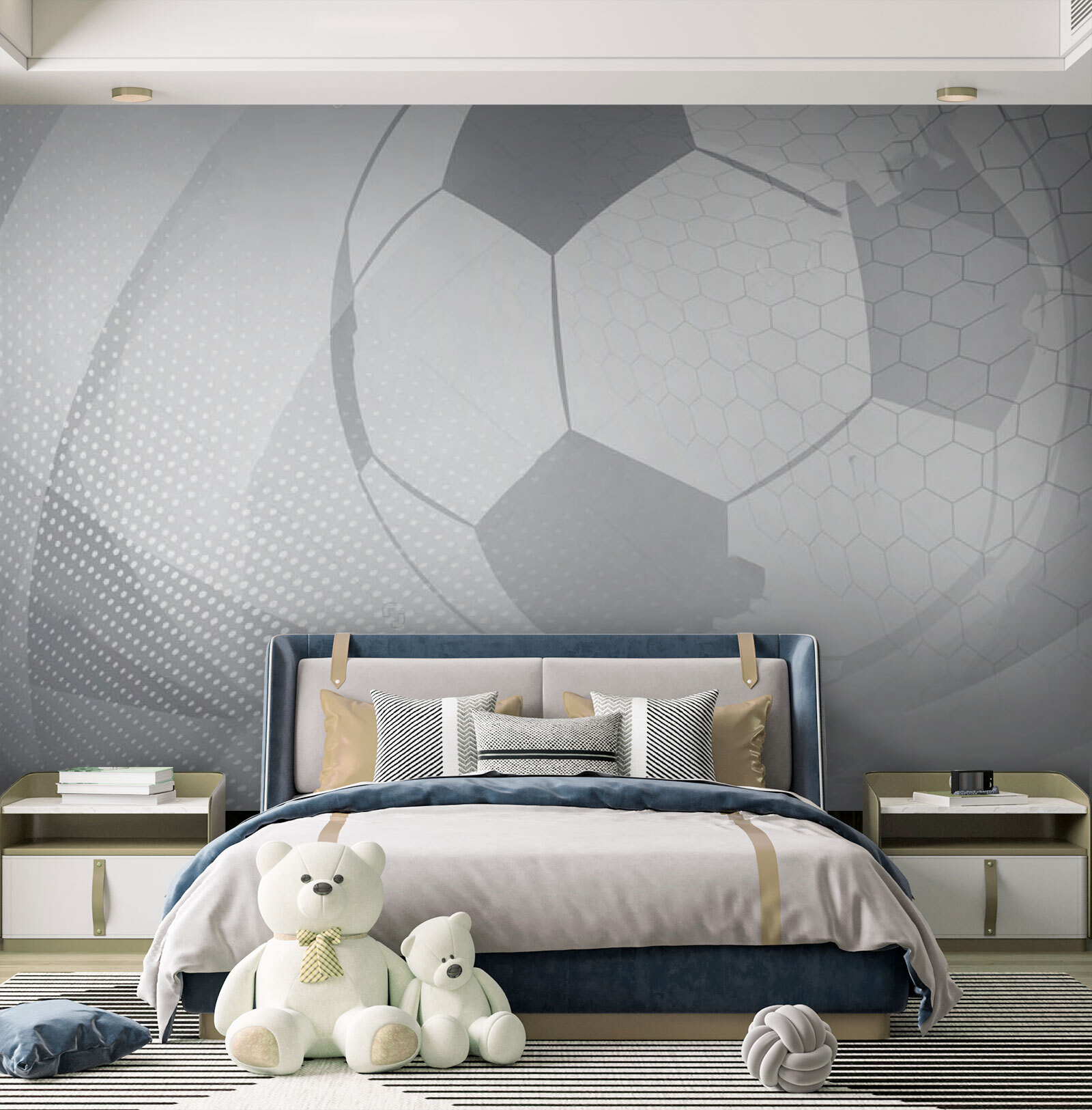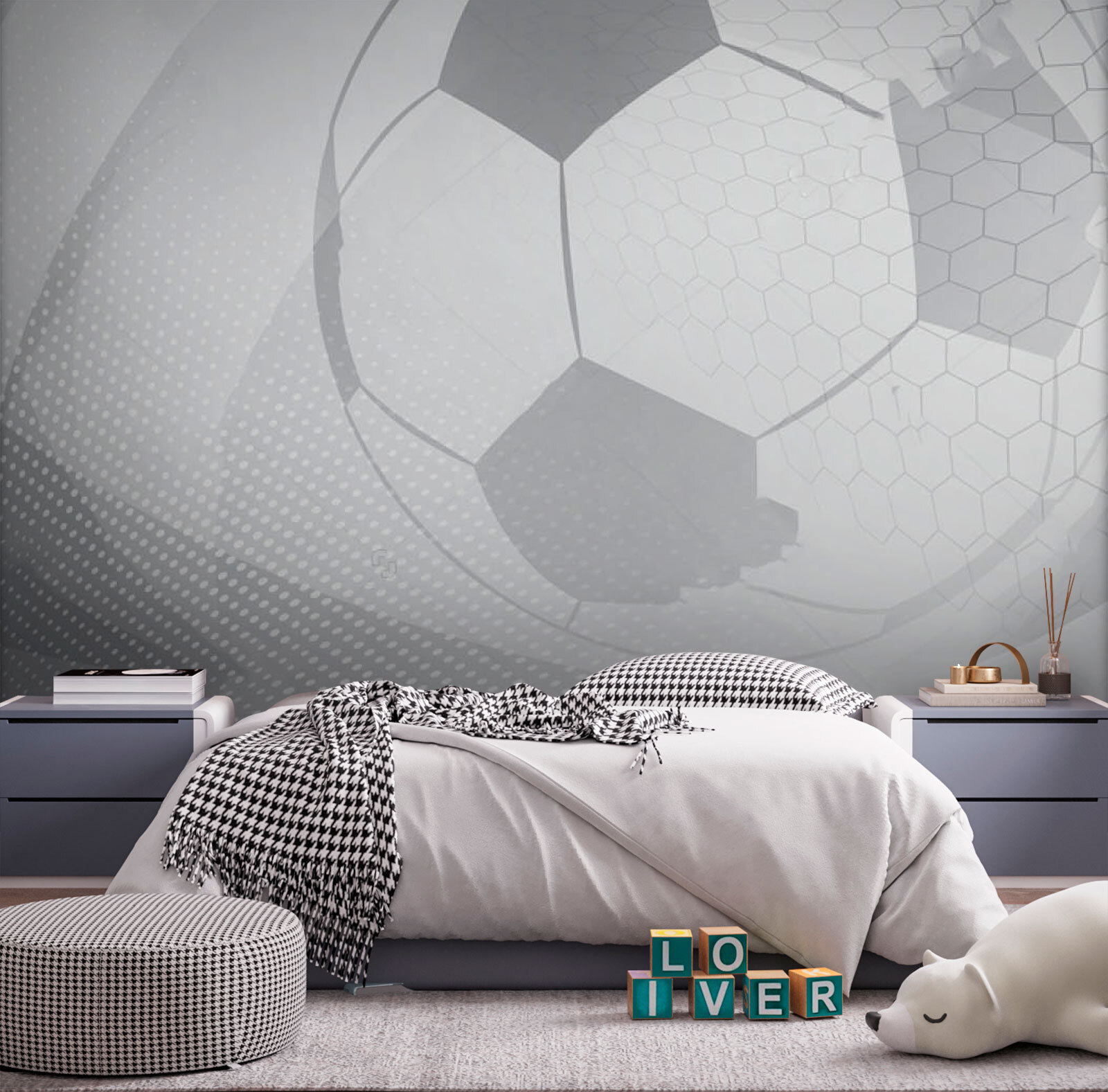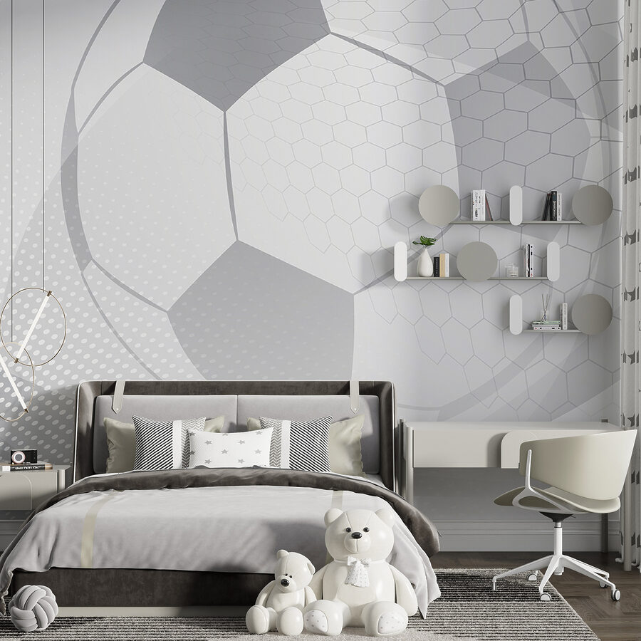 Przekształć dowolną przestrzeń w marzenie miłośnika piłki nożnej dzięki tej geometrycznej fototapecie w odcieniach szarości. Wyobraź sobie dzieci, które rzucają pomysłami, otoczone zabawnym wzorem, który pobudza ich wyobraźnię. Idealna do pokoju zabaw lub sypialni, ta fototapeta dodaje nowoczesny akcent do klasycznych piłkarskich klimatów. Fajne wzory i kształty przyciągają wzrok, tworząc dynamiczną atmosferę, która rozpala emocje i zabawę. To jak świętowanie gola każdego dnia – bez niechlujnych przekąsek! Przygotuj się na dopingowanie kreatywności, jedna ściana na raz.