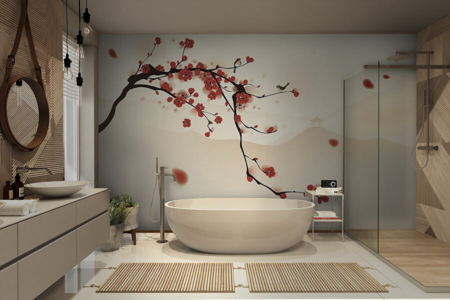Wyobraź sobie: wchodzisz do pokoju i pierwszą rzeczą, którą widzisz, jest oszałamiająca fototapeta z czerwonymi kwiatami na tle spokojnego, odległego krajobrazu. Czujesz się, jakbyś został przeniesiony do sennego, spokojnego miejsca, prawda? Bogate czerwone kwiaty po prostu rzucają się w oczy, a miękkie, mgliste tło dodaje warstwę spokoju, którą trudno opisać. To jak spokojne odosobnienie we własnym domu.