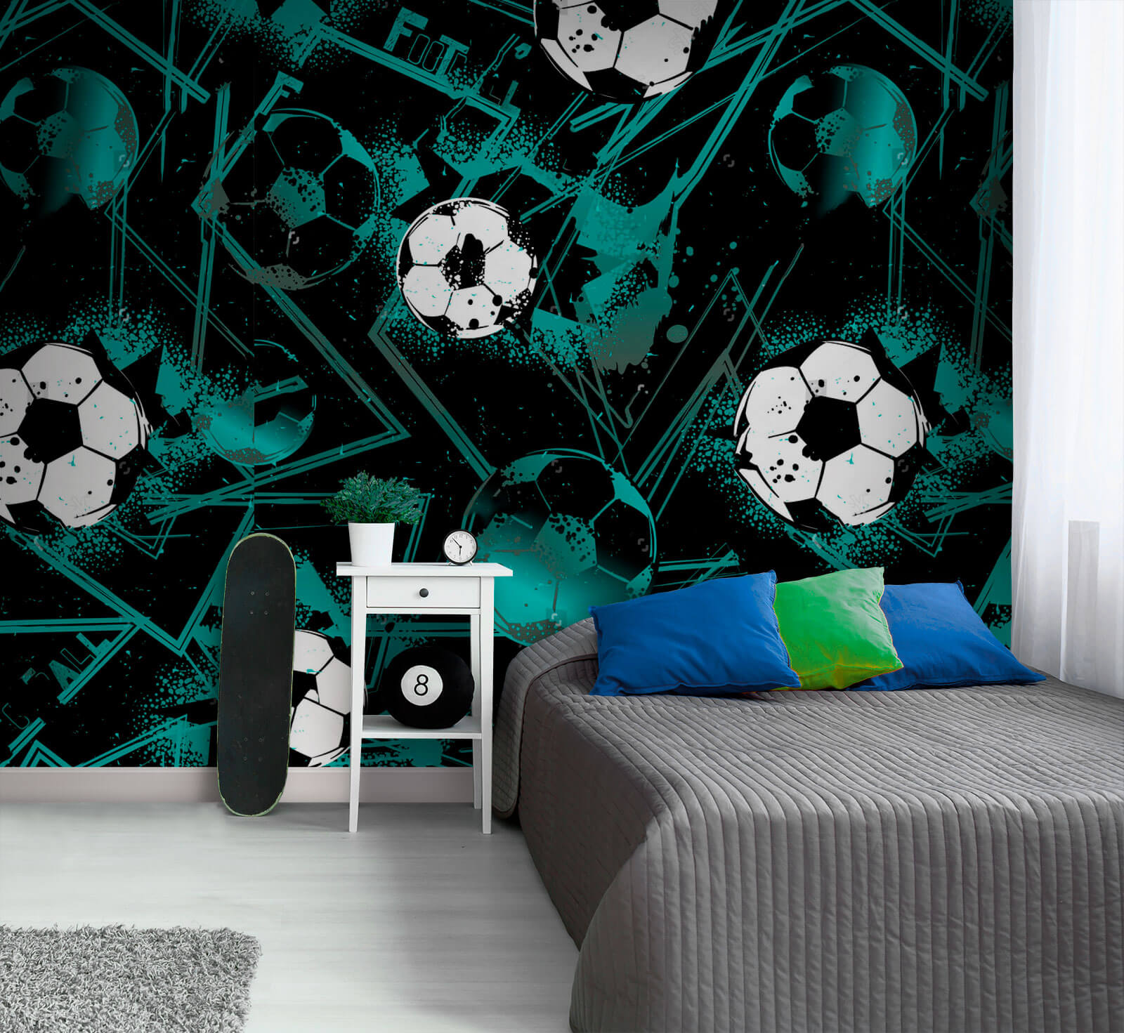 Głęboka czerń w połączeniu z żywymi plamami turkusu tworzą odważne tło, którego nie sposób zignorować. Niezależnie od tego, czy jest to pokój zabaw dla dzieci, czy modny salon, ta fototapeta przekształca zwykłe wnętrze w coś naprawdę ekscytującego. Idealna do pobudzania rozmów między przyjaciółmi lub w chwilach, gdy po prostu chcesz marzyć o następnym wielkim meczu. Po co więc czekać? Wprowadź zabawę i niech dobre czasy się toczą!