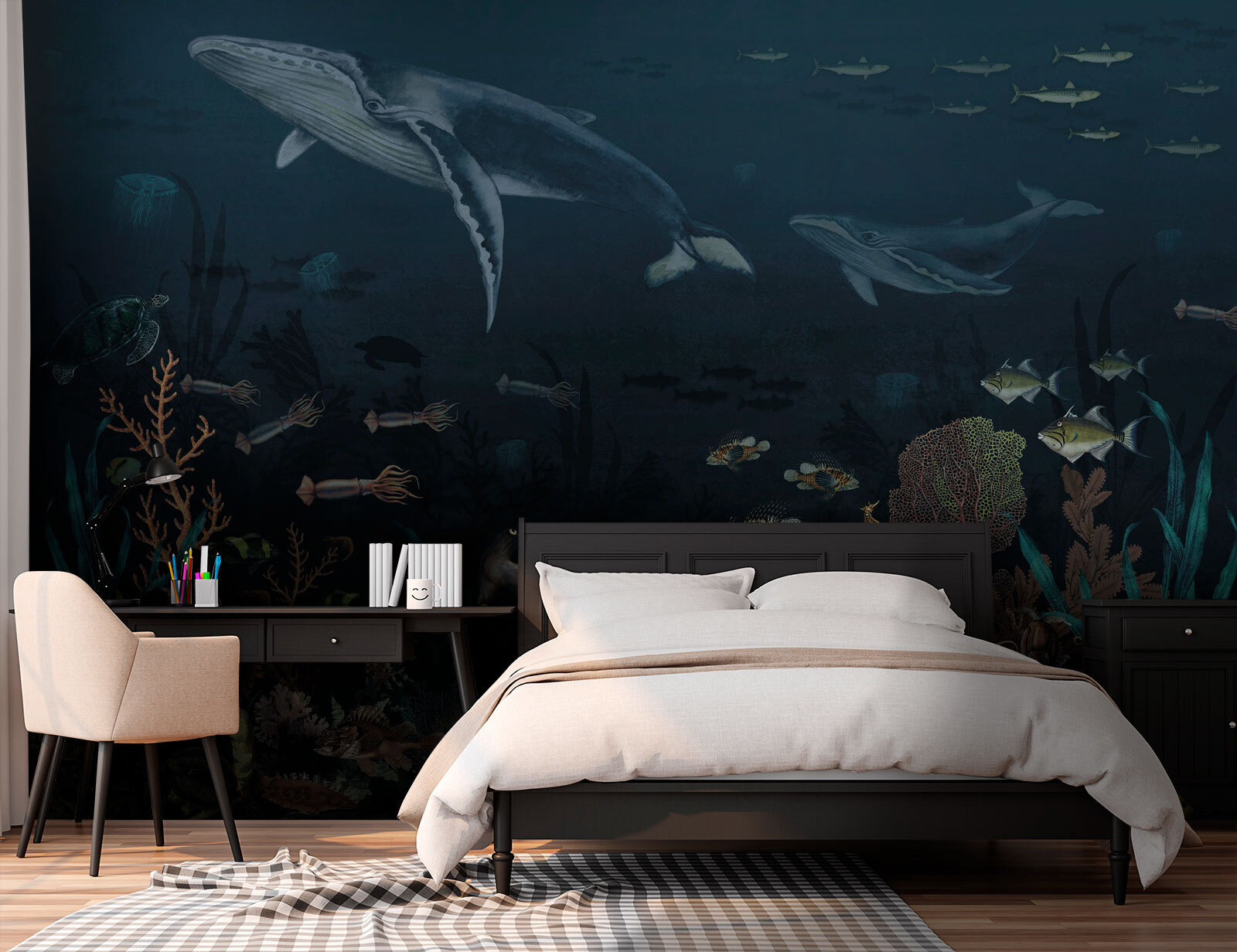 Zanurz się w świecie cudów dzięki tej urzekającej fototapecie ściennej przedstawiającej wieloryby szybujące z gracją w głębinach! Wyobraź to sobie – wchodzisz do pokoju, a tam majestatyczny wieloryb płynie obok kolorowych ryb, żółwi morskich i żywych koralowców. Przynosi natychmiastowe poczucie spokoju i przygody. Idealna do pokoju dziecięcego lub przestrzeni inspirowanej morzem, ta fototapeta pobudza wyobraźnię i sprawia, że marzysz o oceanicznych eskapadach. Wyobraź sobie historie, które może opowiedzieć! Niezależnie od tego, czy jest to czas zabawy, czy przytulne łóżko, ta fototapeta tworzy scenę dla niezliczonych wodnych przygód – a kto nie chciałby tej magii na swoich ścianach? Poczujesz się, jakbyś miał kawałek oceanu w swoim domu.