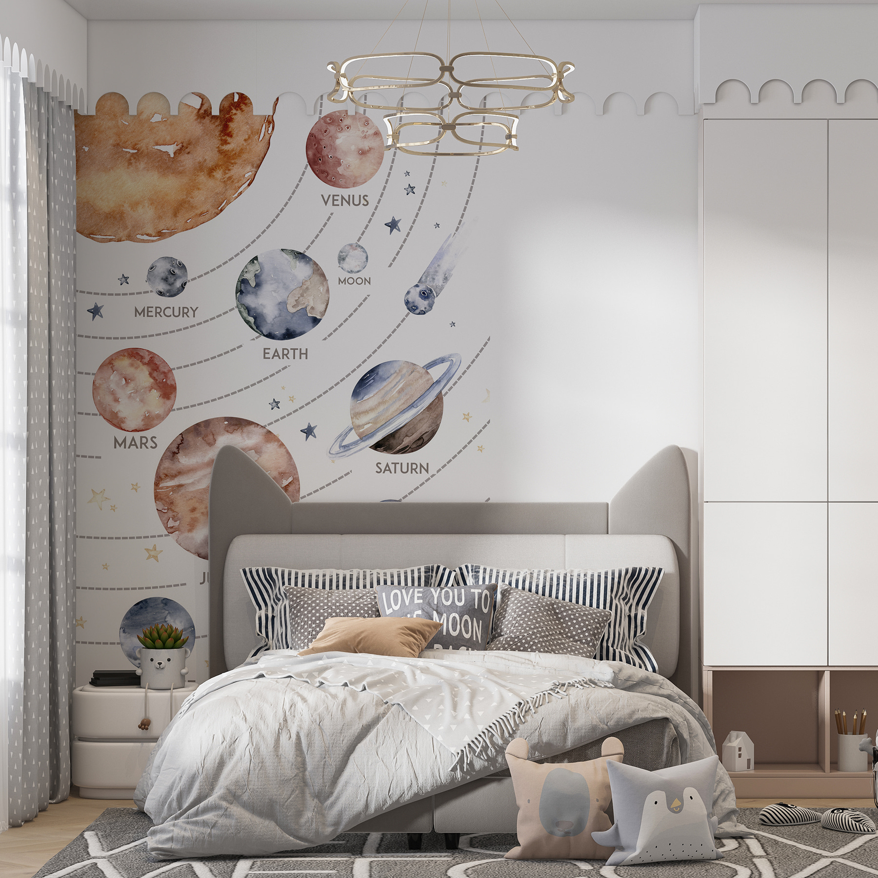 Wyobraź sobie zasypianie w delikatnym blasku pierścieni Saturna lub ożywione zabawy z Merkurym i Jowiszem na straży. Ma ten uspokajający artystyczny klimat, który po prostu czuje się dobrze – nie ma tu sztywnych, nudnych plakatów edukacyjnych. Po prostu piękny, unikalny element, który wnosi odrobinę galaktycznej magii do twojego domu. Niezależnie od tego, czy urządzasz pokój dziecięcy, czy dodajesz uroku pokojowi zabaw, ta fototapeta to świetny wybór. 🌟
