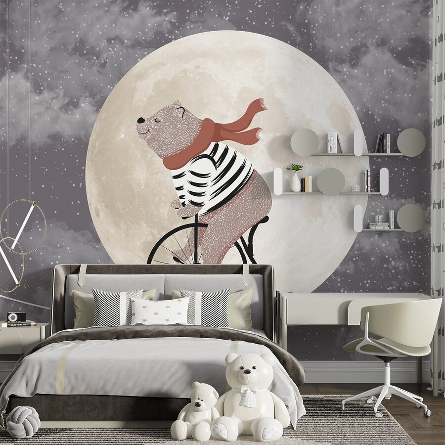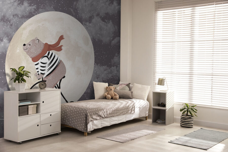 Wyobraź sobie przytulny pokój dziecięcy, w którym bajki na dobranoc ożywają na ścianach. Fototapeta “Bear rides bike across the moon” wnosi ten magiczny klimat prosto do każdej dziecięcej przestrzeni. Jest kapryśna, z tym uroczym niedźwiedziem w pasiastej koszuli i szaliku pedałującym przez gigantyczny, świecący księżyc. Nie trzeba się nad tym zastanawiać – to po prostu zabawne i dziwaczne. Idealny do pobudzenia wyobraźni i być może kilku chichotów. Wyobraź sobie swojego malucha wpatrującego się w to nocą, śniącego wielkie sny. Właśnie takie ciepło przynosi ta fototapeta.