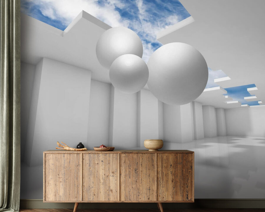 Wkrocz do świata, który przypomina sen, dzięki fototapecie „Biały pokój z białymi ścianami i białymi kulami”. Ta fototapeta oddaje błogi, lekki klimat – jakbyś wkroczył w chmurę w idealny dzień. Wyobraź sobie, że popijasz poranną kawę, patrząc na te figlarne kule unoszące się bezwysiłkowo nad tobą. To tak, jakby pokój mówił: „Zrelaksuj się, nie ma się czym martwić”.