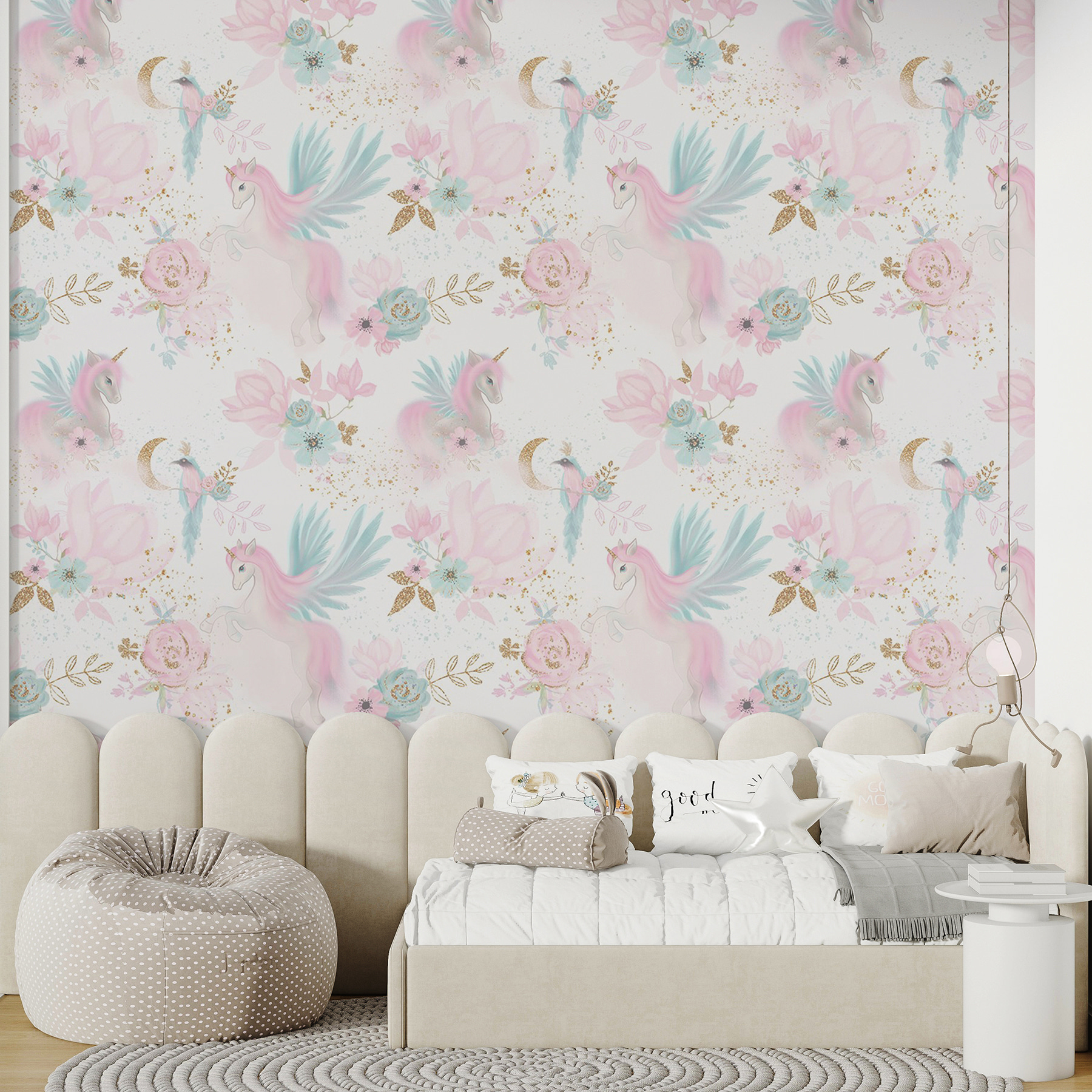Przekształcenie pokoju w kapryśną krainę czarów jest tak proste, jak naklejenie tej fototapety przedstawiającej radosne jednorożce pośród pastelowych kwiatów. Wyobraź to sobie: ponura ściana nagle ożywa, wywołując uśmiechy zarówno u dzieci, jak i dorosłych. Delikatne odcienie tworzą marzycielską atmosferę, idealną do zabawy lub po prostu śnienia. Wyobraź sobie czytanie książki w tym magicznym otoczeniu, gdzie każde spojrzenie jest jak wejście do bajki. Dodaj odrobinę wyobraźni, a otrzymasz przestrzeń, która jest ciepła i zachęcająca, gdzie przygody czekają za każdym rogiem.