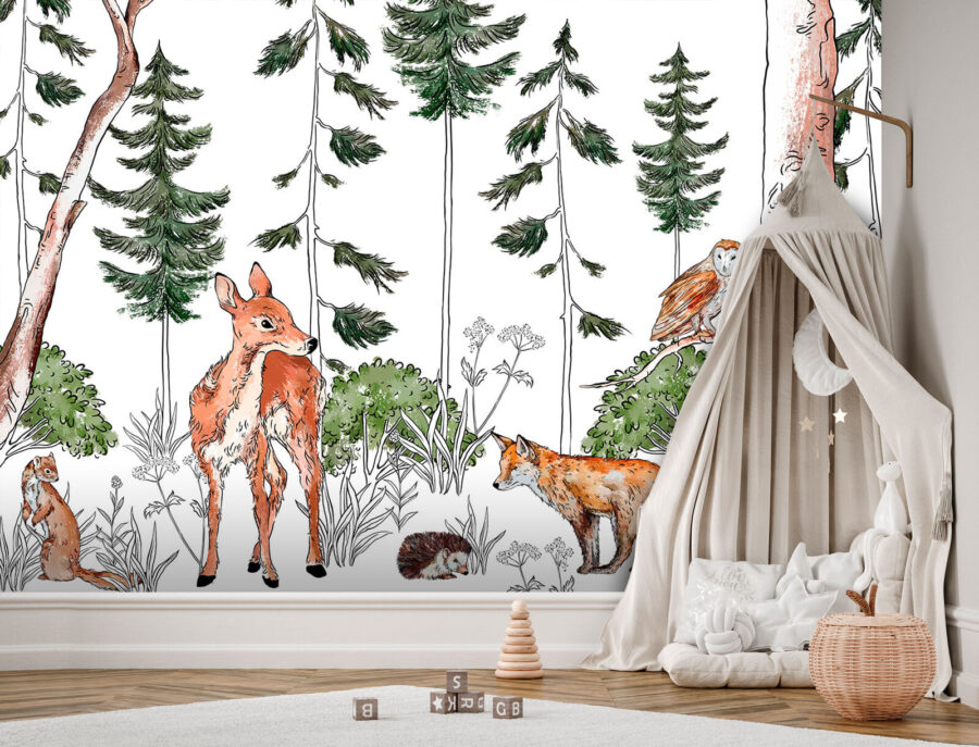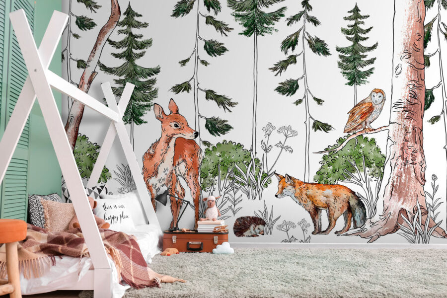 Zmień każde pomieszczenie dzięki tej uroczej fototapecie przedstawiającej urocze leśne zwierzęta! Wyobraź sobie spokojną scenę w lesie, gdzie ciekawski jeleń i figlarny lis spacerują wśród bujnej zieleni. Sowa obserwuje wszystko z góry, dodając odrobinę fantazji. To tak, jakbyś miał kawałek natury na swojej ścianie. Idealna do przytulnego kącika do czytania lub pokoju dziecięcego, ta fototapeta zaprasza naturę do środka, sprawiając, że każde spojrzenie staje się małą przygodą. Rozsiewaj radość i ciepło i pozwól, aby opowieści rozgrywały się w Twoim własnym zaczarowanym lesie – z tymi futrzastymi przyjaciółmi nigdy nie będzie nudno!