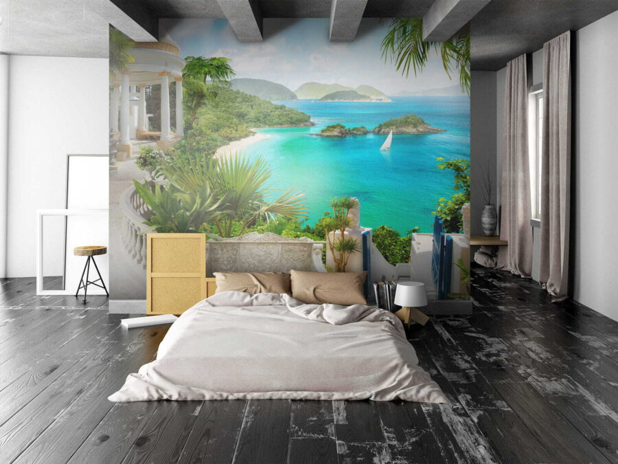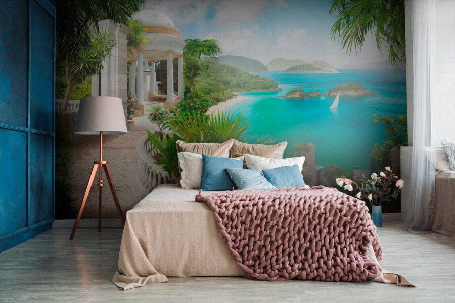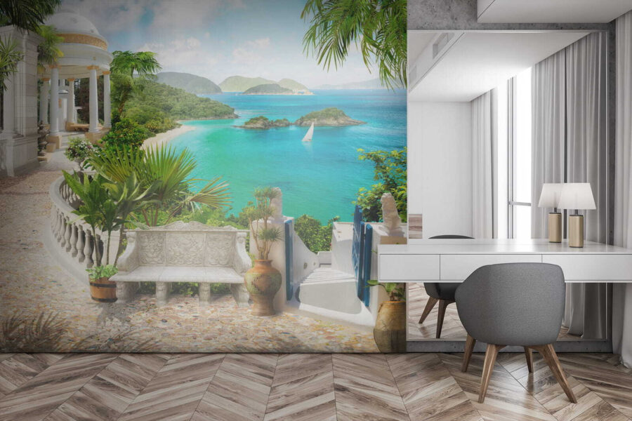 Wyobraź sobie: wchodzisz do swojego pokoju i natychmiast przenosisz się do spokojnego nadmorskiego raju. Dokładnie to robi fototapeta “Roślina w doniczce”. To tak, jakby mieć mini-wakacje bezpośrednio na ścianie. Te bujne zielone rośliny, spokojny biały pawilon i zapierająca dech w piersiach turkusowa woda – to idealny spokój!