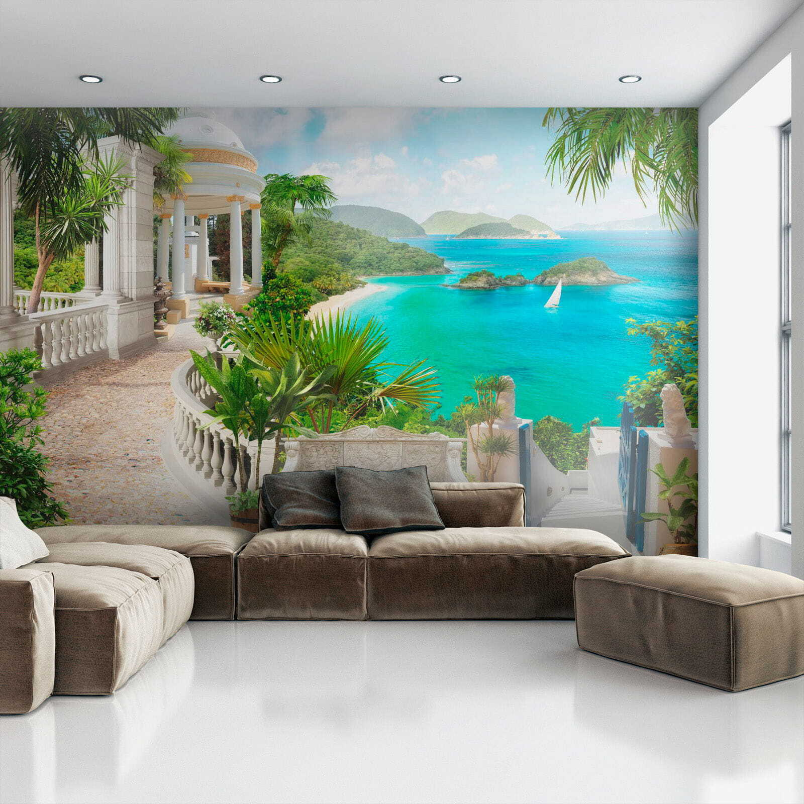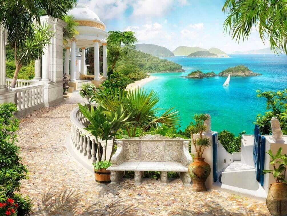 Wyobraź sobie: wchodzisz do swojego pokoju i natychmiast przenosisz się do spokojnego nadmorskiego raju. Dokładnie to robi fototapeta “Roślina w doniczce”. To tak, jakby mieć mini-wakacje bezpośrednio na ścianie. Te bujne zielone rośliny, spokojny biały pawilon i zapierająca dech w piersiach turkusowa woda – to idealny spokój!