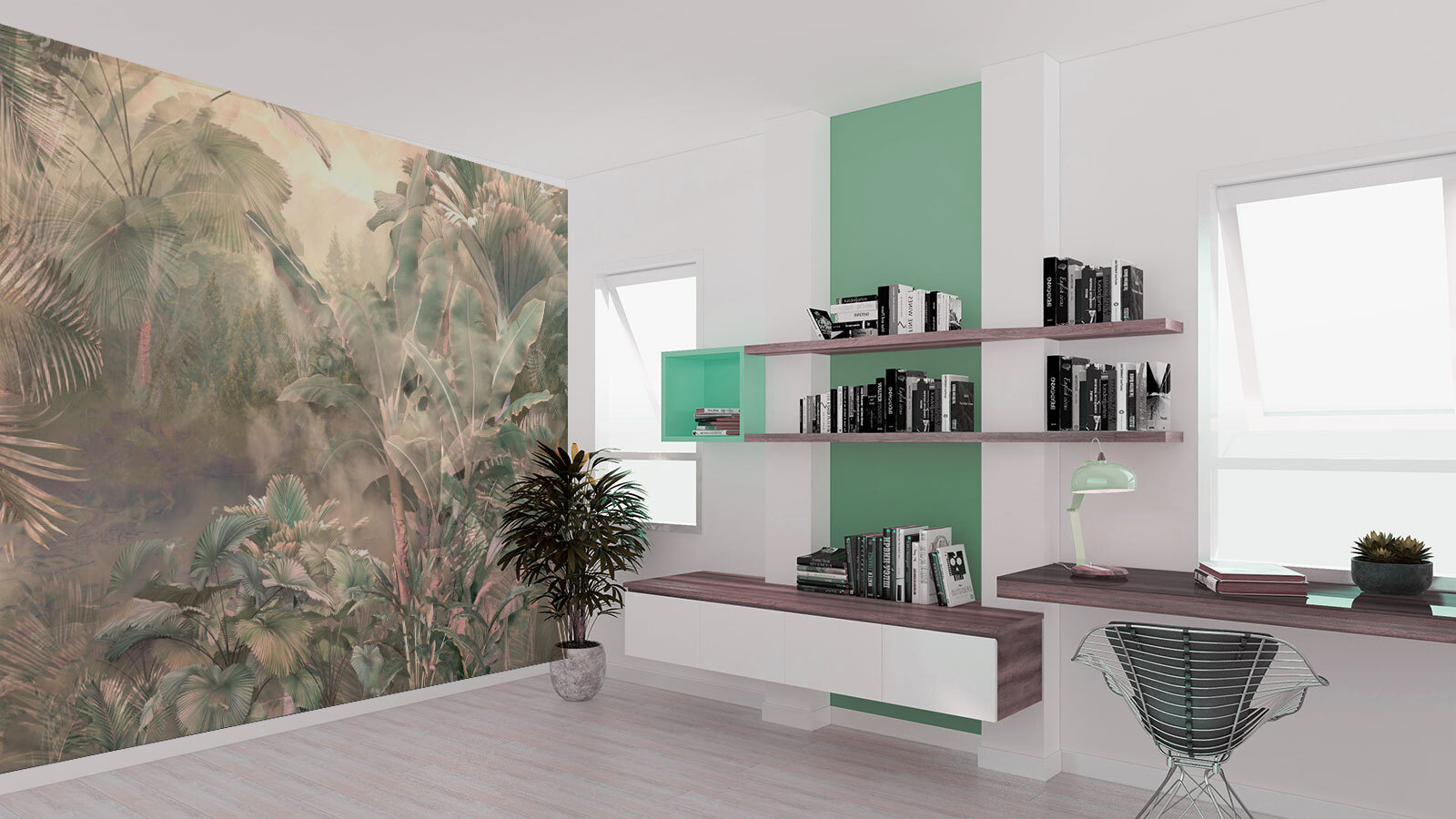 Transform any room into a serene escape with the “Foggy Forest with Trees and Plants” mural. Imagine stepping into a misty jungle, where soft greens and nature’s whispers mingle. This mural’s gentle allure invites tranquility—perfect for cozy spaces or even that busy office that could use a moment of zen. The lush foliage almost sways in the breeze, can you feel it? Picture those lazy afternoons, sipping tea while you pretend you’re lounging in a rainforest. A splash of nature’s beauty comes home, and let’s be honest—who wouldn’t want that? Accessorize with a few potted plants, and boom—instant jungle vibes!