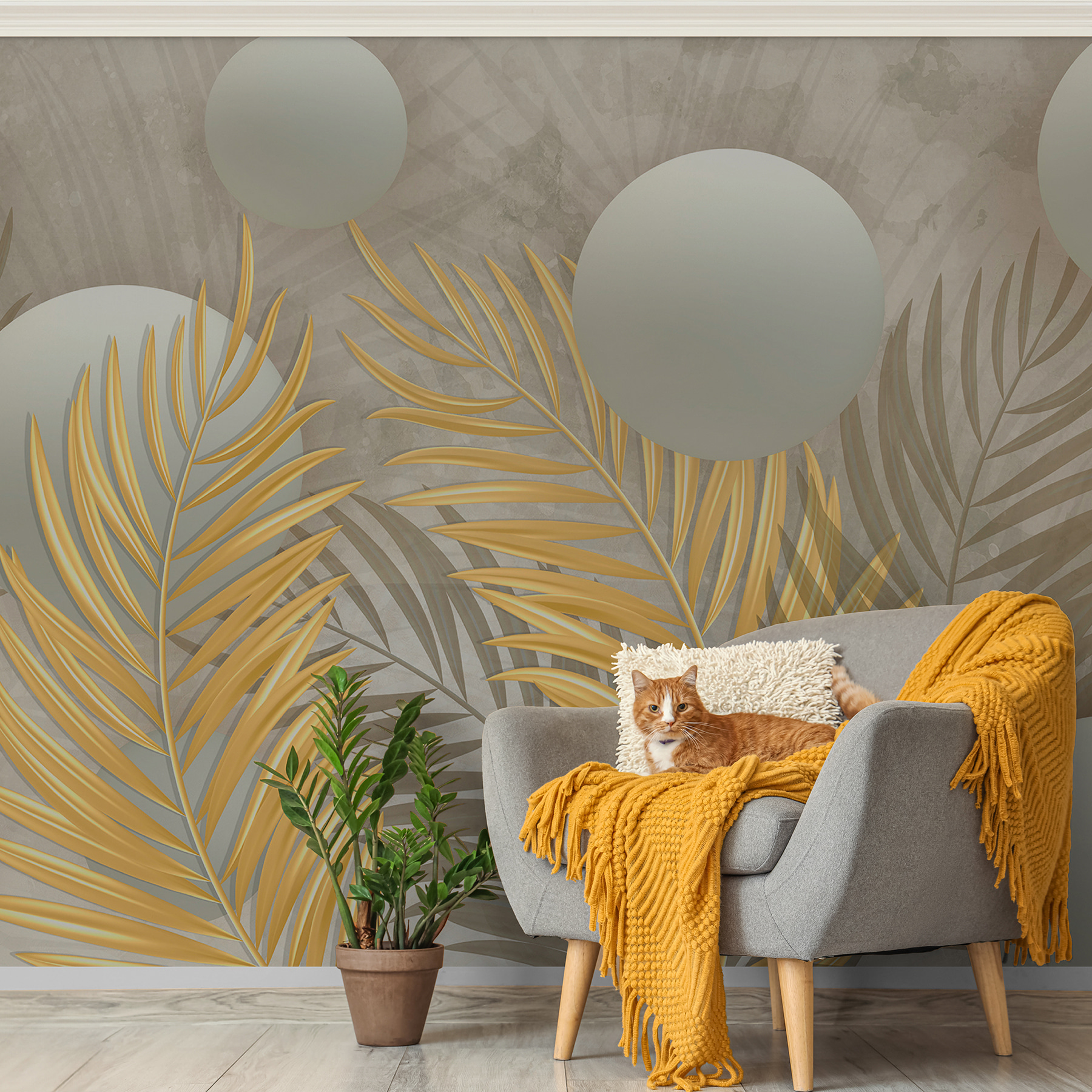 Przekształć dowolną ścianę w miejsce do rozmów dzięki tej oszałamiającej fototapecie. Wyobraź sobie, że wchodzisz do pokoju, w którym gładkie kule wydają się unosić na sennym tle, otoczone delikatnymi liśćmi, które tańczą po powierzchni. Idealny do przytulnego kącika do czytania lub eleganckiego studia, ten projekt łączy w sobie nowoczesny klimat bez utraty kontaktu z naturą. To tak, jakby wnieść odrobinę światła słonecznego do wnętrza, gdzie nawet ponure dni stają się jaśniejsze. Znajomi będą chcieli wiedzieć, skąd pochodzi, a kto nie kocha odrobiny natury? Uśmiechniesz się za każdym razem, gdy przejdziesz obok. To nie tylko dekoracja; to doświadczenie!