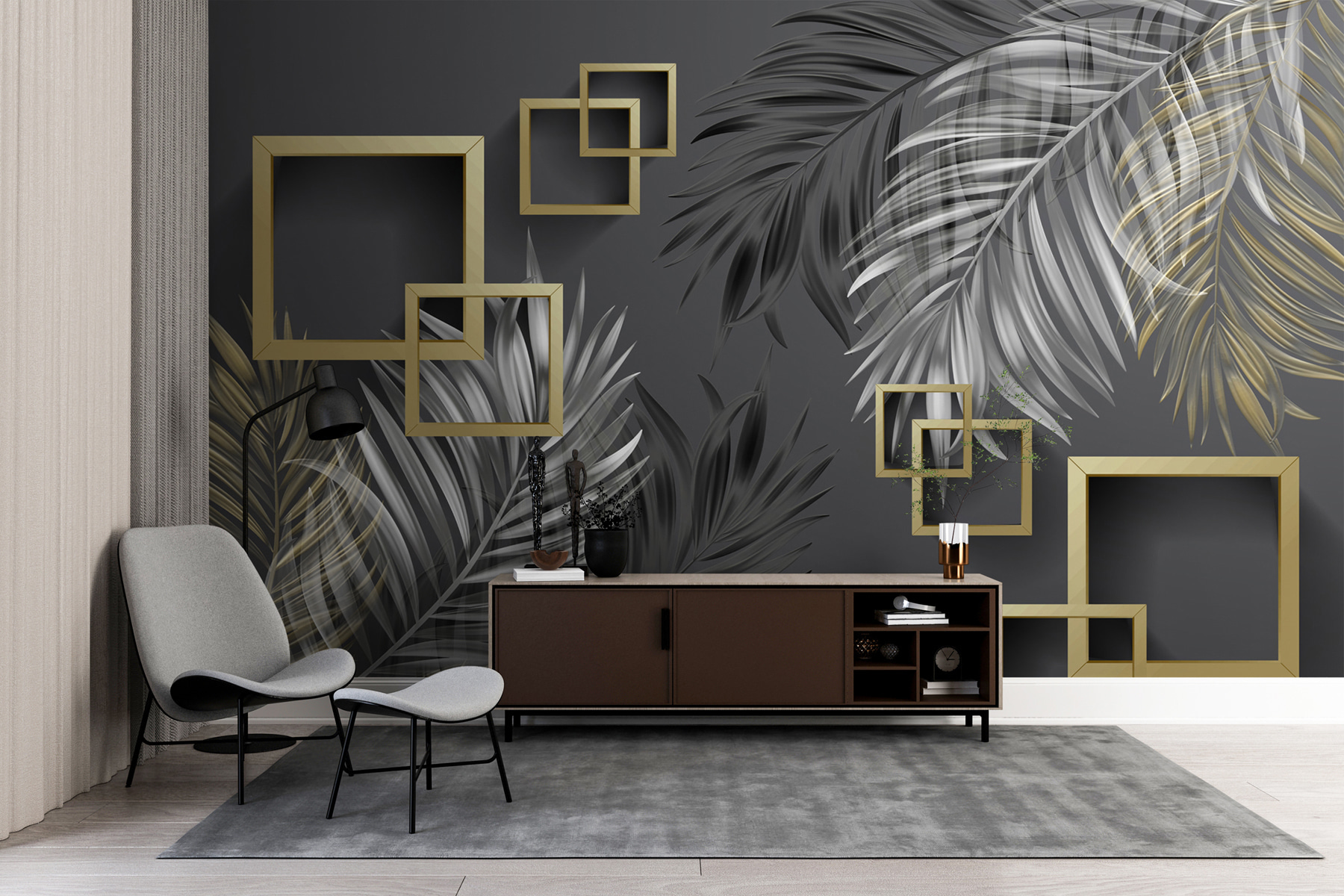 Odmień swoją przestrzeń dzięki tej oszałamiającej fototapecie ściennej, która płynnie łączy eleganckie wzory ramek z tropikalnym stylem. Wyobraź to sobie: wylegujesz się w swoim salonie, otoczony bujnymi piórami, podczas gdy oszałamiająca gama geometrycznych ramek przyciąga wzrok. To jak elegancka galeria sztuki w twoim domu, bez snooty vibe.