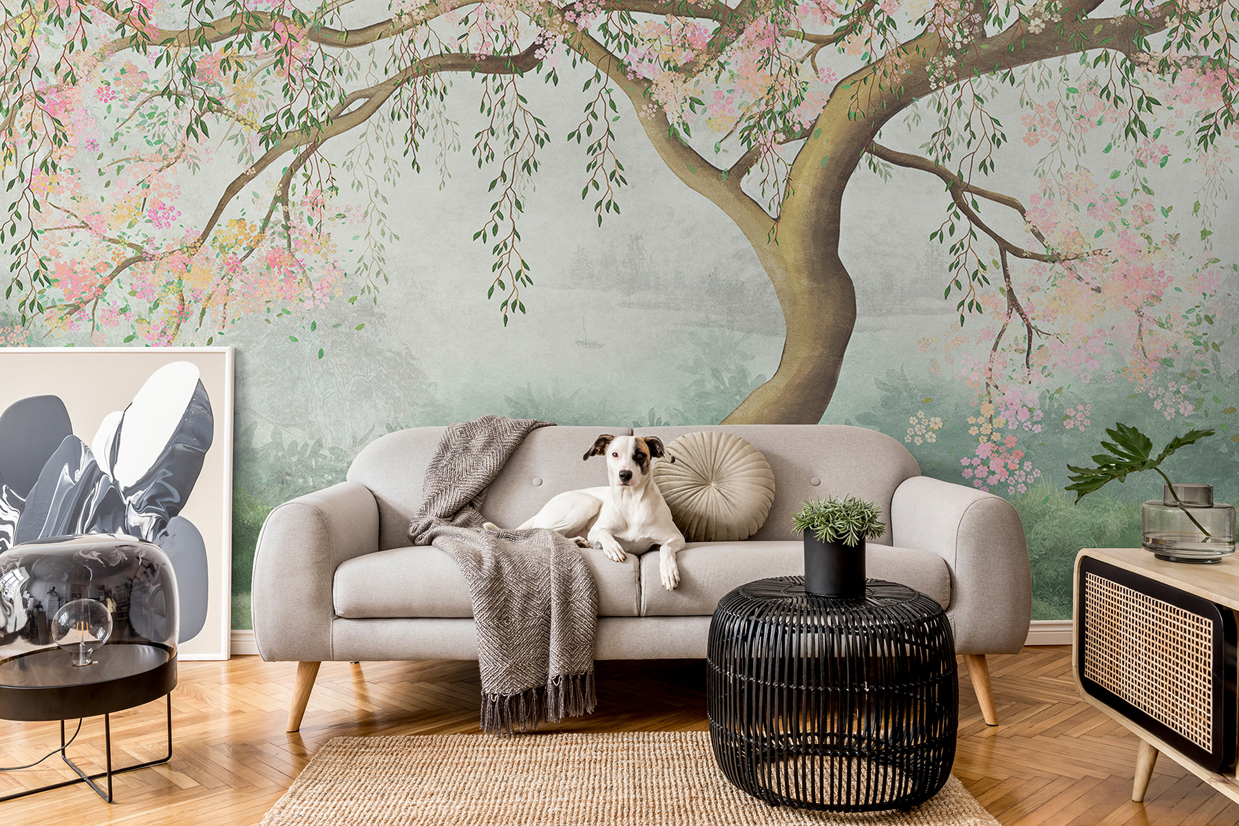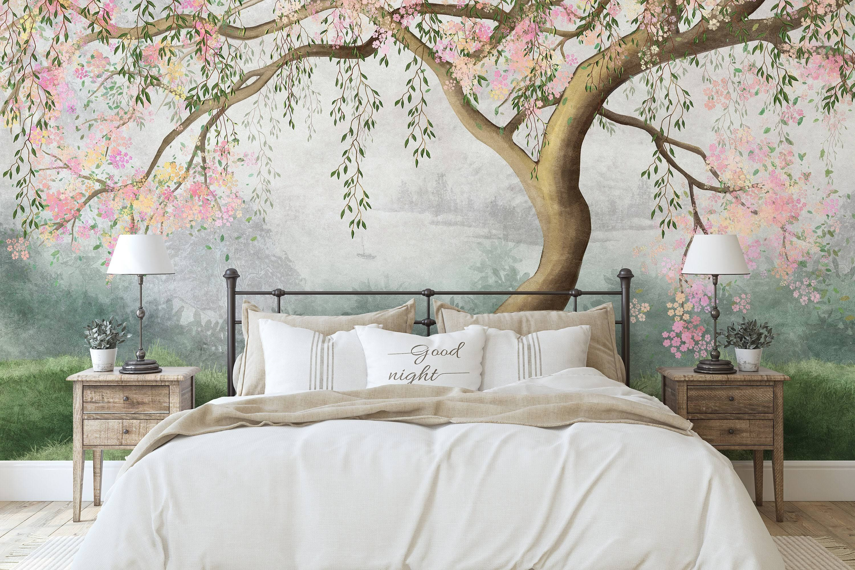 A te kwiaty? Wyglądają, jakby mogły unieść się ze ściany. A drzewo, ze swoimi wdzięcznymi gałęziami, wydaje się zapraszać, by usiąść pod nim na spokojną chwilę. Po prostu zatrzymaj się, weź to wszystko – poczuj, jak spokój przenika do twojego dnia. Wyobraź sobie tę fototapetę rzucającą spokojny blask podczas opowiadania bajek na dobranoc lub stanowiącą łagodne tło dla codziennego zgiełku.