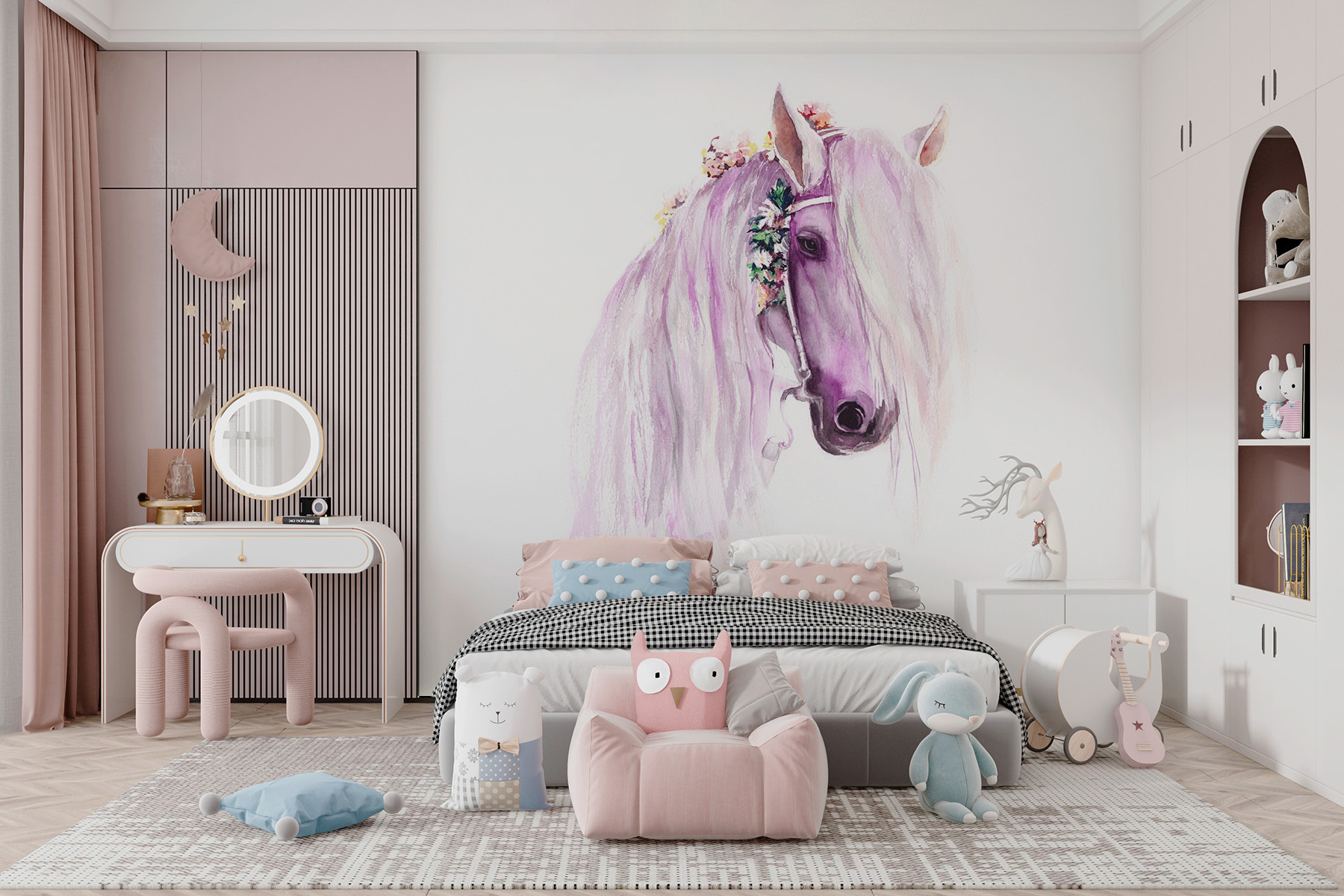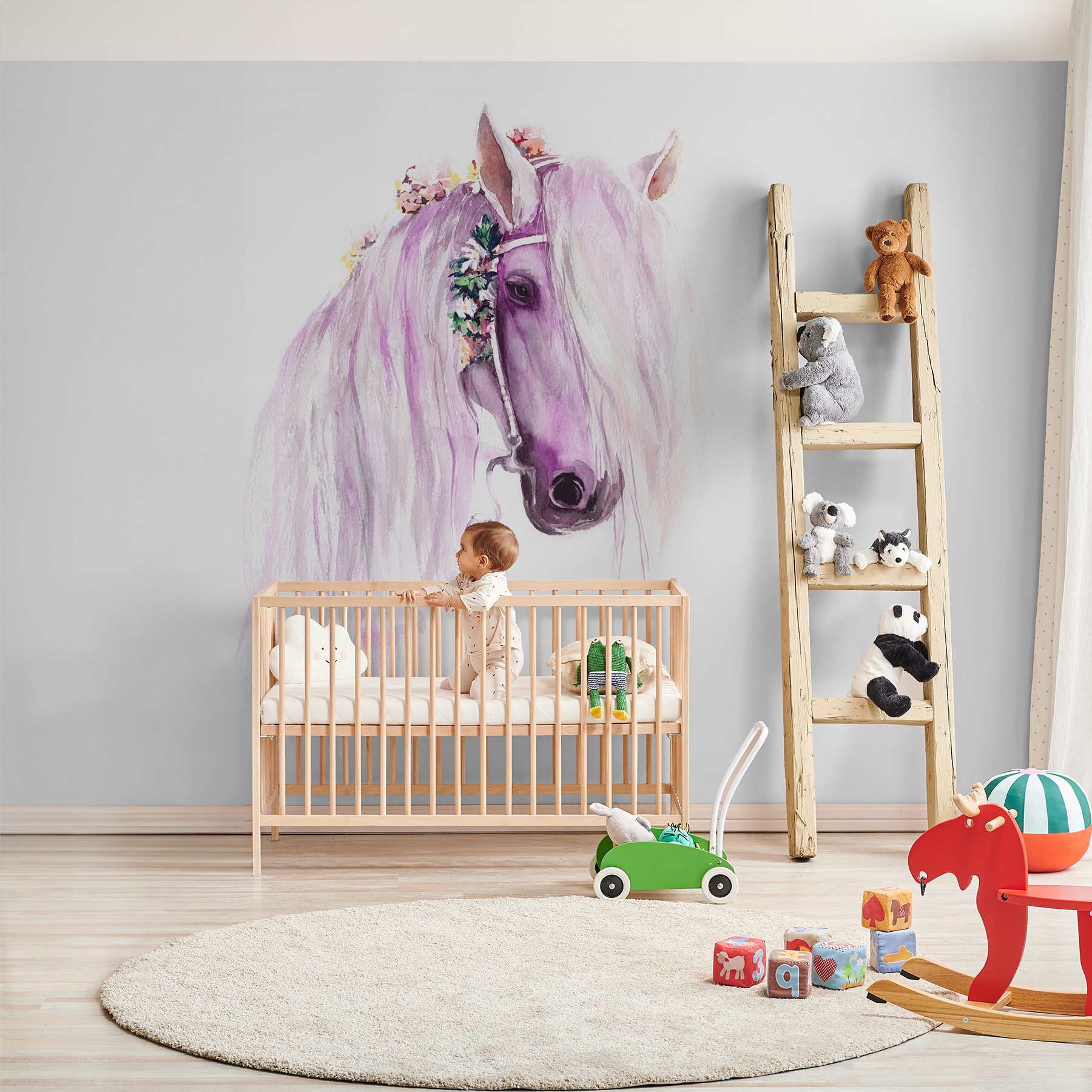 Odmień pokój dzięki tej zachwycającej akwarelowej fototapecie przedstawiającej konia, który wygląda, jakby wyszedł prosto z bajki. Wyobraź sobie oczarowanie, gdy maluchy wpatrują się w jego płynącą grzywę, wprowadzając odrobinę kaprysu do pokoju zabaw lub pokoju dziecięcego. To nie tylko okładzina ścienna; to zaproszenie do marzeń. Wyobraź sobie leniwe popołudnia spędzone na wyobrażaniu sobie przygód na łące, a miękkie kolory otulą przestrzeń delikatnym uściskiem. Ta fototapeta oferuje uroczą ucieczkę, idealną do podsycania młodej wyobraźni lub po prostu rozjaśnienia nudnej ściany. Kto nie chciałby mieć takiego mitycznego przyjaciela?