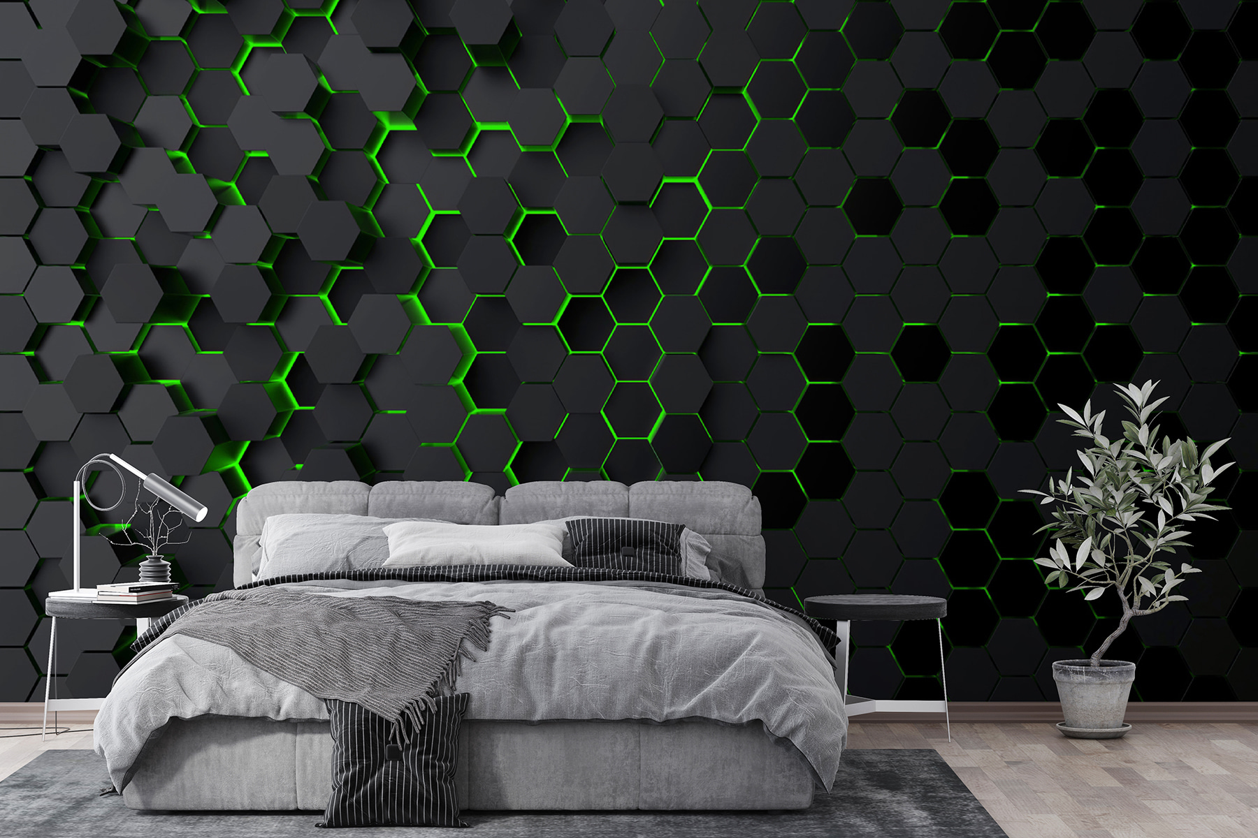 Zobacz fototapetę “Czarne sześciokąty z zielonym światłem”! To jak wejście do futurystycznego plastra miodu, ale w chłodniejszym wydaniu. Wyobraź sobie, że twoja przestrzeń – salon, biuro, a nawet sypialnia – zyskuje zupełnie nowy klimat. Te geometryczne kształty są tak stylowe. A zielone podświetlenie? Całkowicie nieoczekiwany zwrot akcji, który rzuca się w oczy, zwłaszcza w słabym oświetleniu.