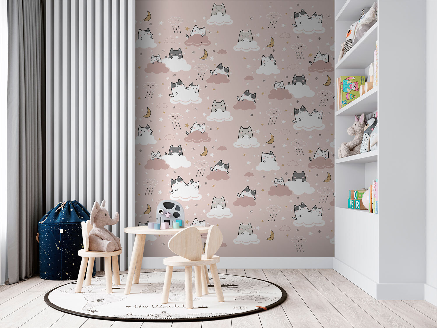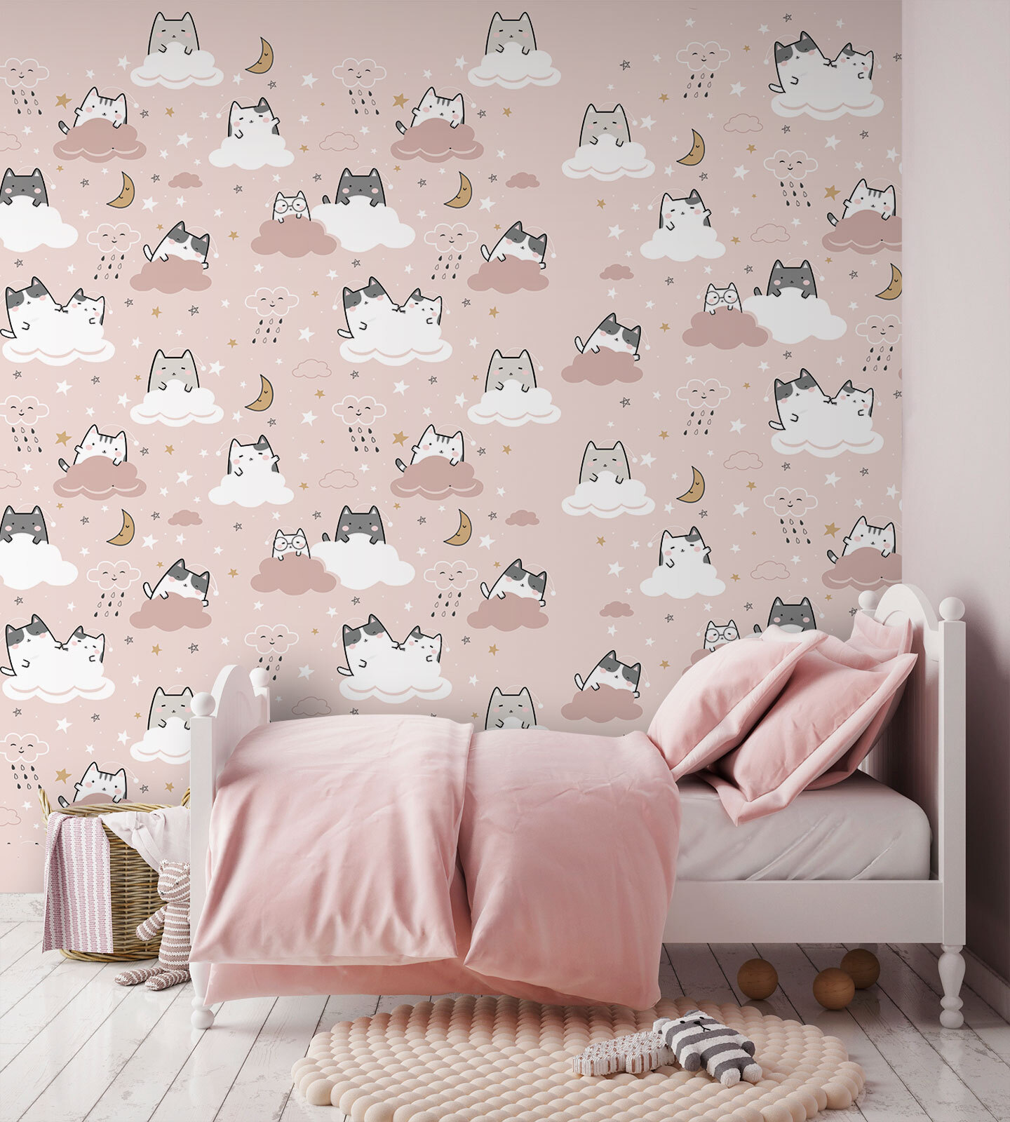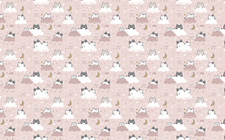 Miękkie, pastelowe chmurki są przytulone do śpiących gwiazd i malutkich księżyców, dzięki czemu wyglądają jak scena prosto z bajki na dobranoc. Każdy kotek wygląda tak przytulnie, że możesz chcieć do niego dołączyć. To coś więcej niż tylko dekoracja; to odrobina magii, która sprawi, że każda przestrzeń stanie się oazą komfortu i rozkoszy.