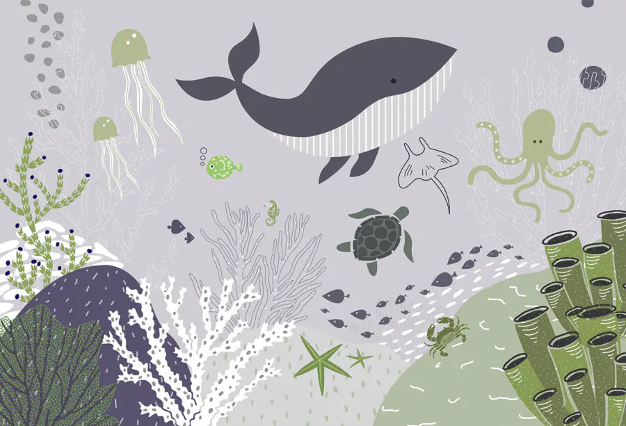 Gotowy, aby zmienić swoje ściany w podwodną przygodę? Sprawdź tę uroczą fototapetę “Karykatura wieloryba”! Wyobraź sobie figlarnego wieloryba, do którego dołączają jego rozkoszni towarzysze z oceanu – meduzy, żółwie, a nawet bezczelna ośmiornica – a wszystko to w przytulnym, kapryśnym stylu akwareli. To jak głębokie zanurzenie się w magicznym morzu bezpośrednio z salonu lub sypialni dziecka.