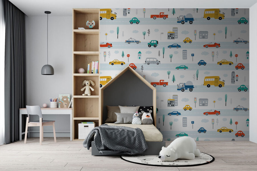 Zobacz tę uroczą fototapetę ścienną “Wzór samochodów i budynków” – idealną do rozjaśnienia pokoju każdego dziecka! Wyobraź sobie zabawną scenę miejską z kolorowymi samochodami jadącymi ulicą i uroczymi małymi budynkami dodającymi żywego akcentu. To jak przeniesienie odrobiny ulubionego animowanego miasta prosto na ścianę.