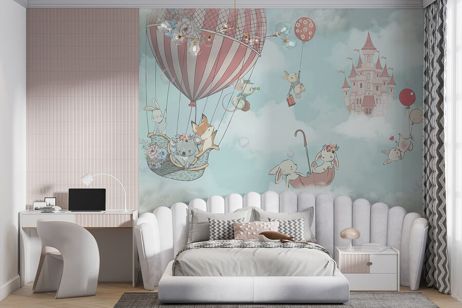 Maluchy pokochają dostrzeganie uroczych detali – koala z kwiatową koroną, małe króliczki z balonikami, a wszystko to unoszące się wśród puszystych chmur z sennym zamkiem w tle. Cała scena sprawia wrażenie czarującej, jakby zaraz po przebudzeniu dzieci mogły wskoczyć do swojej własnej bajki.