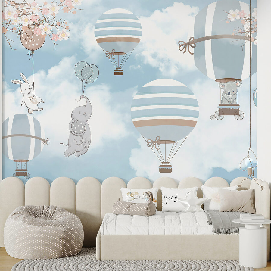 Masz pokój dziecięcy, który potrzebuje odrobiny kaprysu? Sprawdź tę zachwycającą fototapetę przedstawiającą grupę uroczych słoni latających w balonach na ogrzane powietrze. Wyobraź to sobie: delikatne błękity i miękkie szarości, parada figlarnych pachyderm i kapryśne tło nieba, które przypomina sen. Idealne, by wywołać niekończące się zachwyty i przygody w przestrzeni każdego malucha. Wyobraź sobie, jak oczy twojego syna rozjaśniają się, gdy zasypia pod wesołymi słoniami i uroczymi balonami. Ta fototapeta to nie tylko dekoracja – to brama do wyobraźni. Wypełnij pokój swojego dziecka radością i pozwól, aby przygoda nabrała rozpędu!