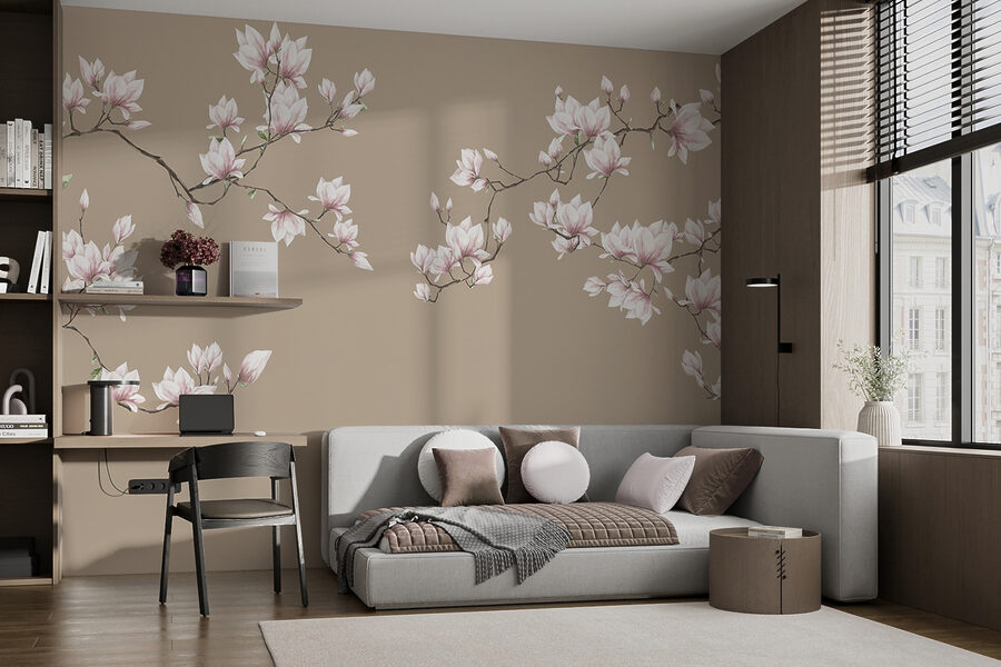 Odmień swoją przestrzeń dzięki czarującej fototapecie ściennej Kwitnące gałęzie magnolii w pastelowych kolorach! Wyobraź sobie, że wchodzisz do pokoju, w którym delikatne kwiaty magnolii rozpościerają się na ścianach, natychmiast poprawiając nastrój. Delikatna, pastelowa paleta barw emanuje ciepłem i spokojem, idealnie nadając się do przytulnego kącika do czytania, a nawet do tętniącego życiem salonu.