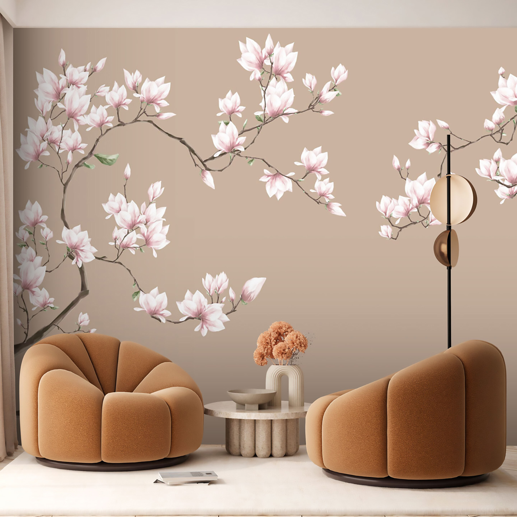 Odmień swoją przestrzeń dzięki czarującej fototapecie ściennej Kwitnące gałęzie magnolii w pastelowych kolorach! Wyobraź sobie, że wchodzisz do pokoju, w którym delikatne kwiaty magnolii rozpościerają się na ścianach, natychmiast poprawiając nastrój. Delikatna, pastelowa paleta barw emanuje ciepłem i spokojem, idealnie nadając się do przytulnego kącika do czytania, a nawet do tętniącego życiem salonu.
