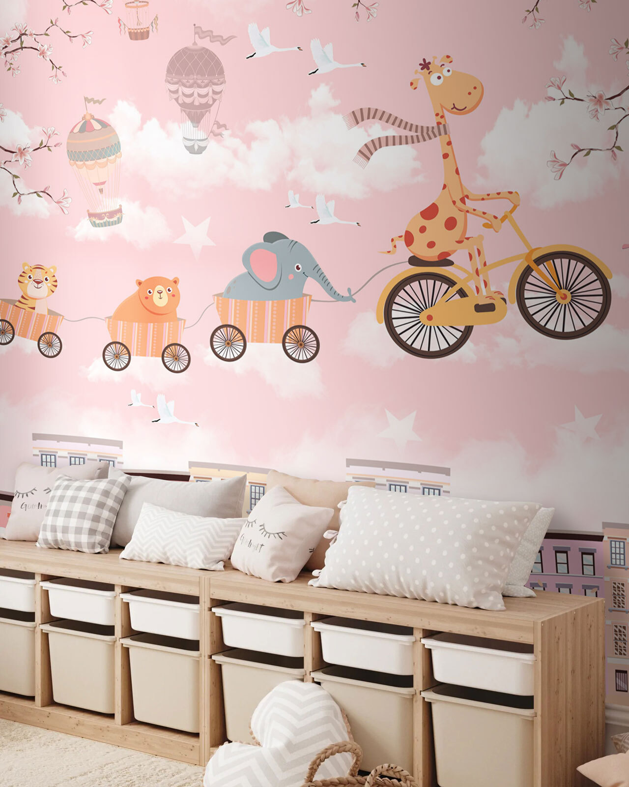 Wyobraź sobie, że każdego ranka budzisz się z przygodą! Ta zabawna fototapeta ścienna “Zwierzęta szczęśliwie przemierzające niebo” z kolekcji dziecięcych fototapet ściennych wniesie czystą radość do każdego pomieszczenia. Wyobraź sobie żyrafę i jej uroczych zwierzęcych przyjaciół szybujących przez puszyste chmury pośród pastelowych domów i balonów na ogrzane powietrze – to jak ich własna kapryśna parada. Idealny do pokoju malucha, rozbudza radość i pobudza wyobraźnię. Dzieci mogą chichotać, gdy marzą o dołączeniu do zabawy, czując się, jakby odbyły własną sekretną podniebną podróż. Urocza i podnosząca na duchu fototapeta zamienia puste ściany w wymarzoną scenę z bajki.