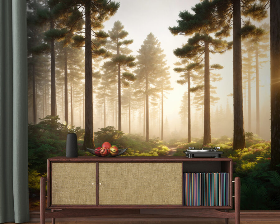 Odmień każdą przestrzeń dzięki spokojnej atmosferze tej fototapety ściennej przedstawiającej pogodną leśną ścieżkę o wschodzie słońca. Wyobraź sobie budzenie się każdego ranka w tej spokojnej scenerii, w której delikatne światło przenika przez wysokie drzewa, tworząc przytulną atmosferę. To tak, jakby mieć naturę w domu, bez robaków i zabłoconych butów. Wyobraź sobie, że popijasz kawę, zagubiony w myślach, wpatrując się w ten spokojny widok. Żywe zielenie i ciepłe odcienie mogą po prostu wywołać marzenie o wędrówce do lasu. Idealna do salonu lub przytulnego kącika do czytania, ta fototapeta przenosi na zewnątrz, zapraszając do relaksu i odrobiny magii.