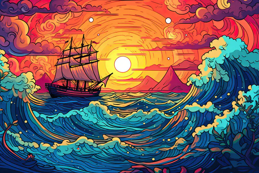 Wyobraź sobie słońce zachodzące nad falami i majestatyczny statek przepływający obok. Twój maluch może marzyć o pirackich przygodach lub po prostu cieszyć się spokojną nadmorską scenerią. Nie jest to jednak fototapeta tylko dla dzieci – idealnie pasuje do pokoju o tematyce nadmorskiej lub dowolnej przestrzeni, która potrzebuje odrobiny piękna natury.