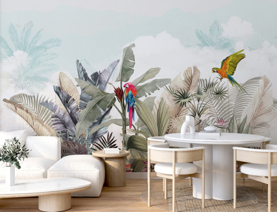 Poznaj swoją nową ścienną obsesję: fototapetę “Kolorowa papuga latająca w powietrzu”. To tak, jakby marzenie obserwatora ptaków wylądowało w twoim salonie! Wyobraź sobie dwie żywe papugi szybujące nad zielenią i tropikalnymi kwiatami. To jak mini-wakacje w lesie deszczowym – bez komarów, dzięki Bogu!