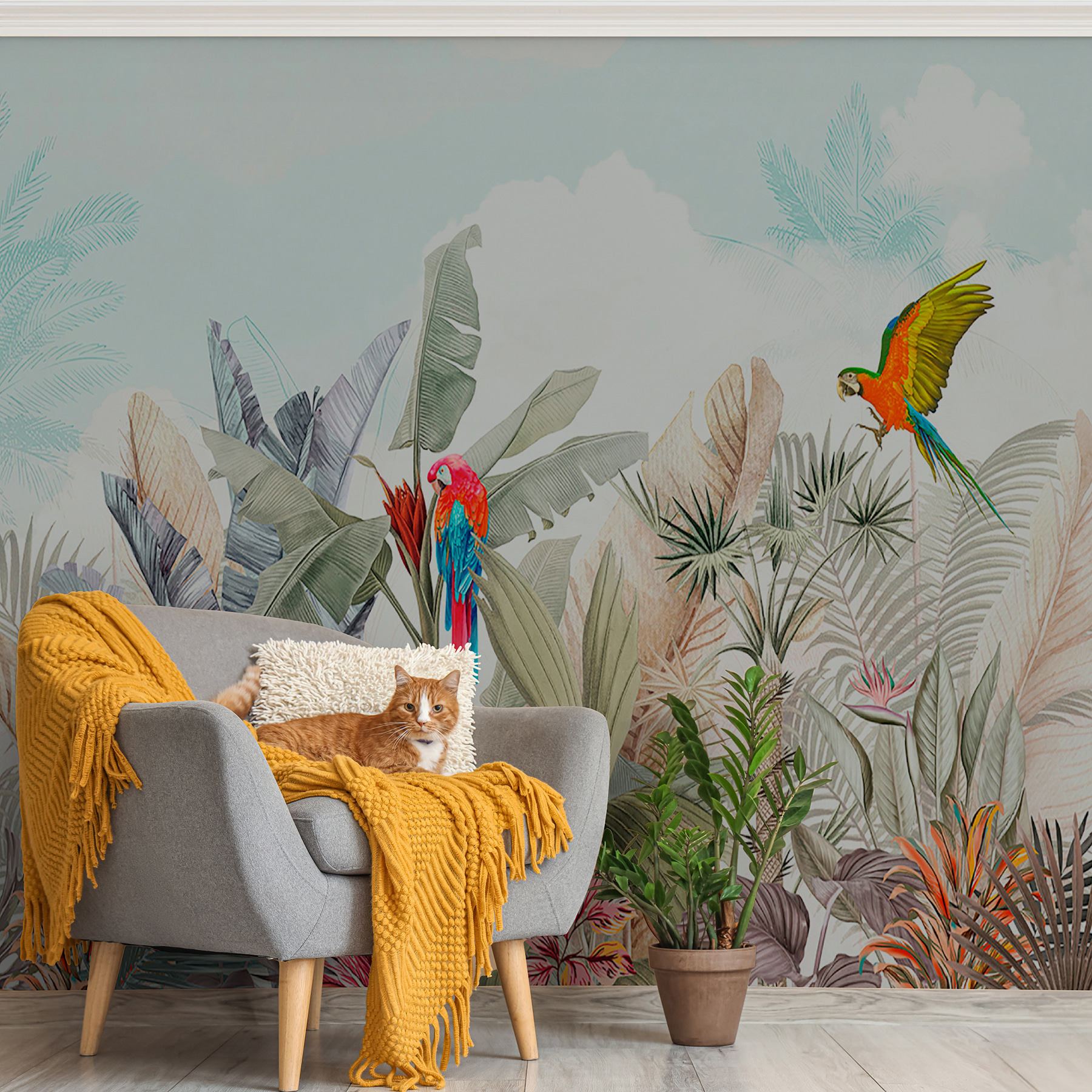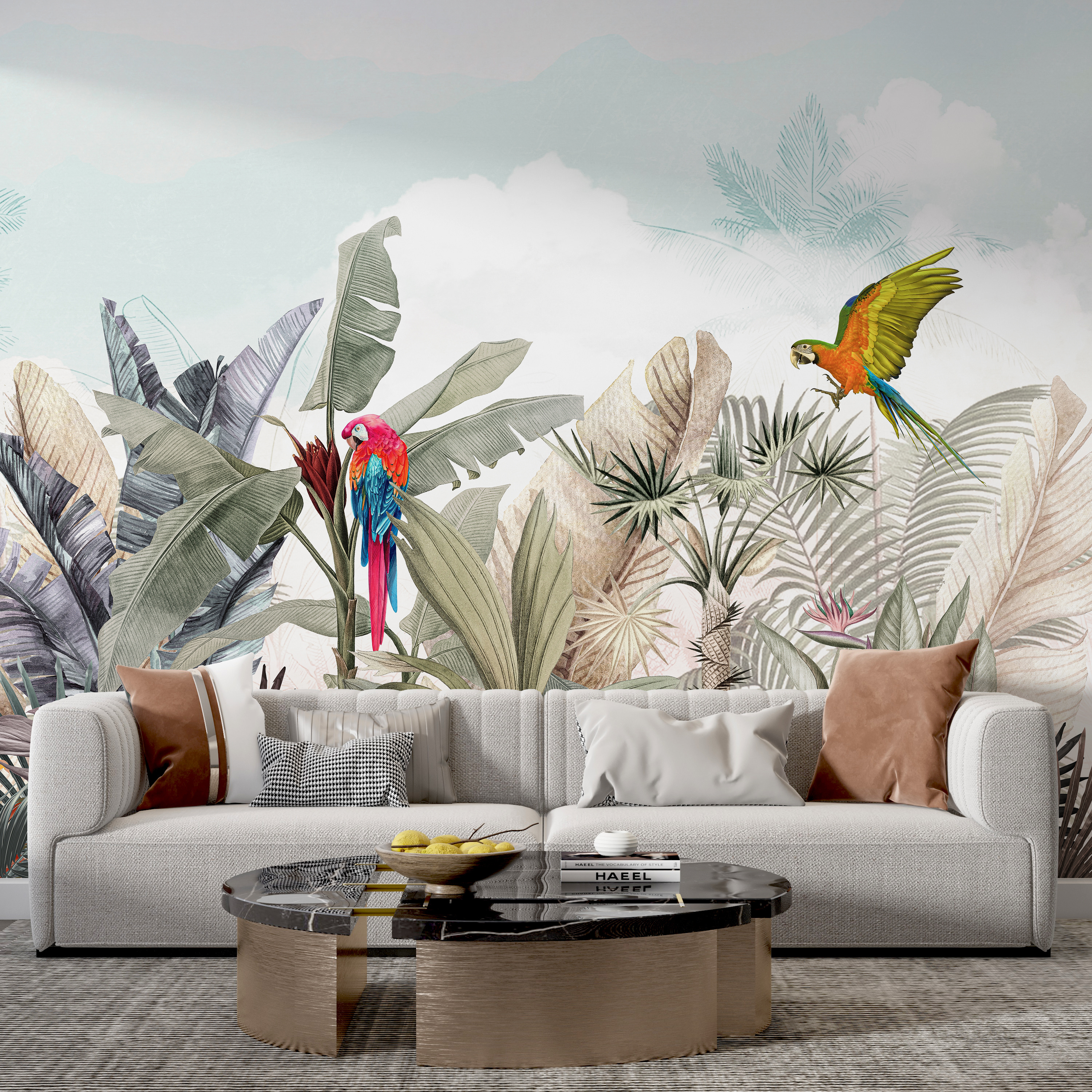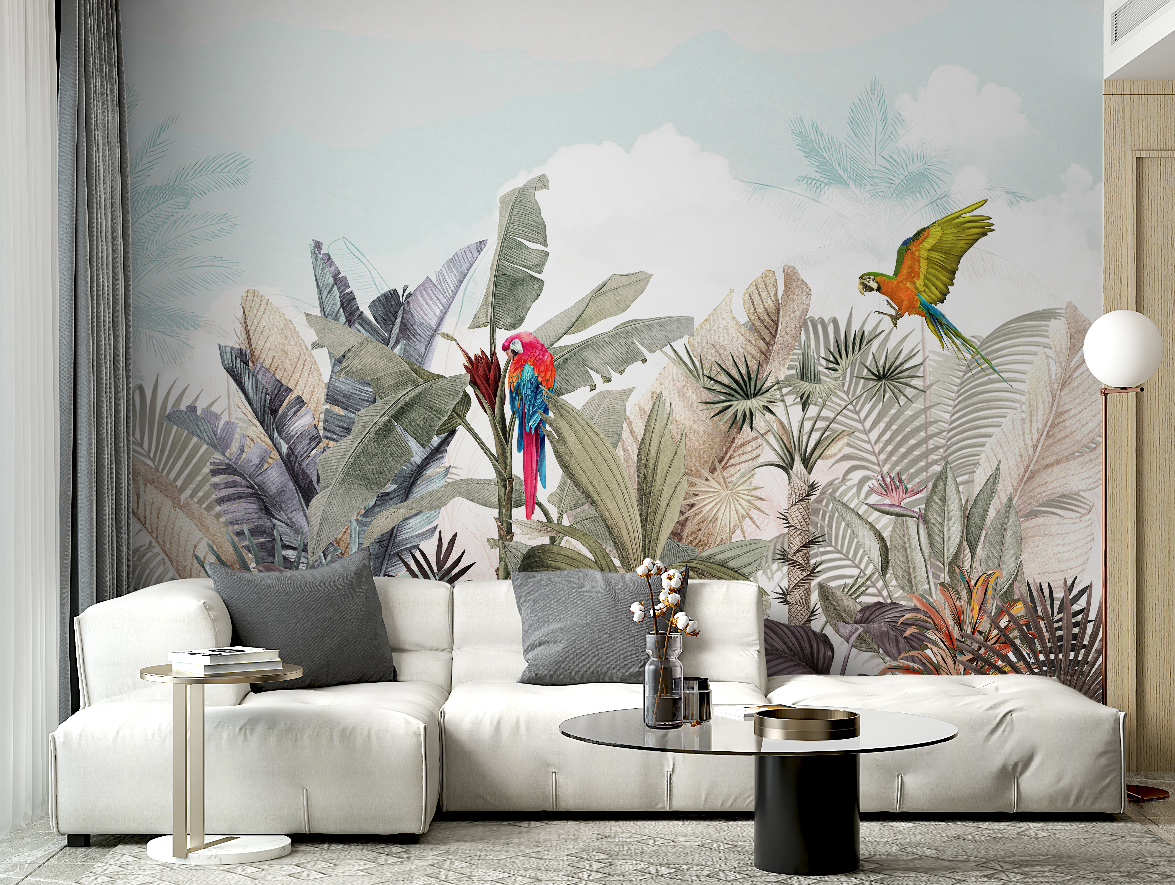 Poznaj swoją nową ścienną obsesję: fototapetę “Kolorowa papuga latająca w powietrzu”. To tak, jakby marzenie obserwatora ptaków wylądowało w twoim salonie! Wyobraź sobie dwie żywe papugi szybujące nad zielenią i tropikalnymi kwiatami. To jak mini-wakacje w lesie deszczowym – bez komarów, dzięki Bogu!