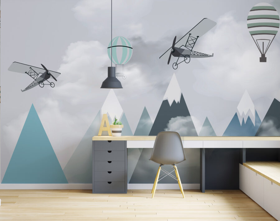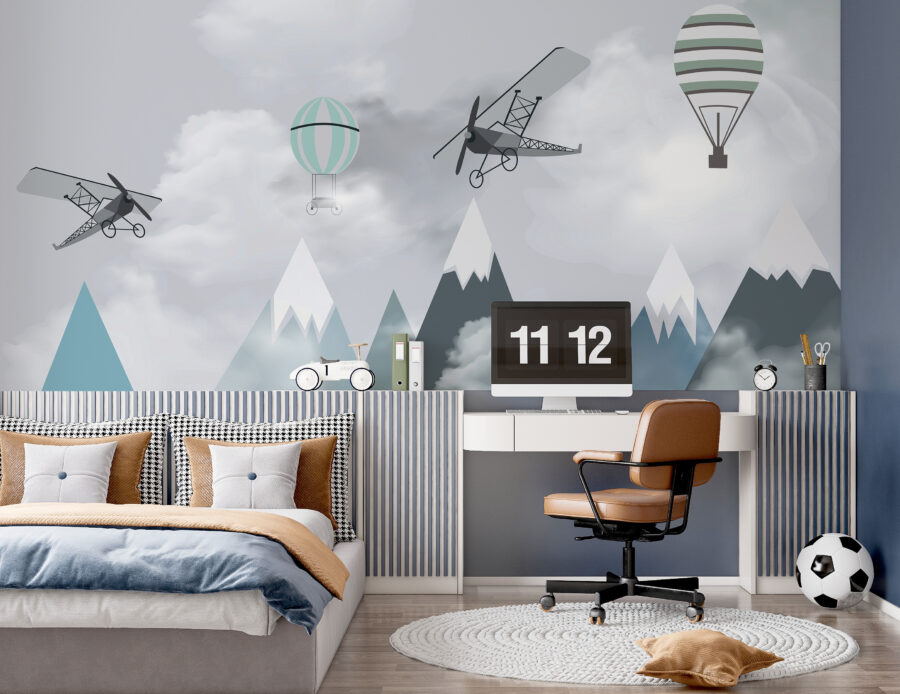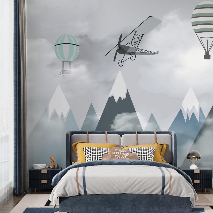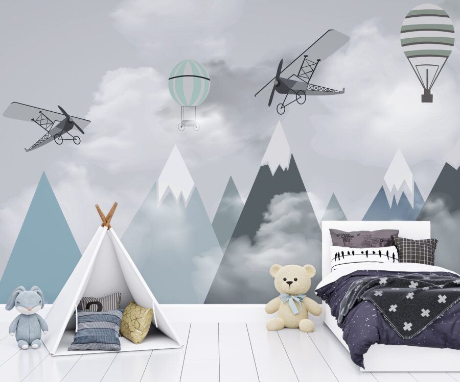 Wyobraź sobie, że pokój Twojego dziecka zmienia się w senną, podniebną przygodę dzięki tej zachwycającej fototapecie ściennej “Samoloty i balony nad górami”. To jak wejście do bajki, w której kapryśne samoloty i balony na gorące powietrze leniwie dryfują nad pogodnymi górskimi szczytami. Idealna dla małego lotnika lub aspirującego odkrywcy, ta fototapeta pobudza poczucie zachwytu i nieskończonych możliwości.