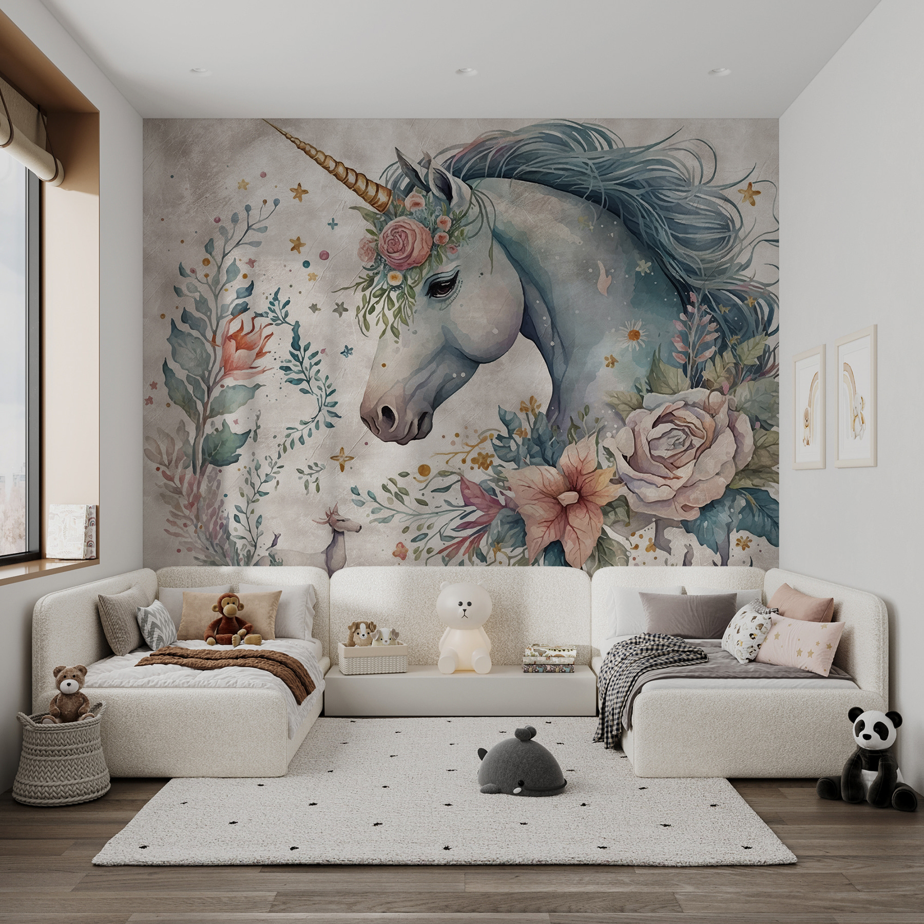 Wyobraź sobie, że wchodzisz do pokoju i jesteś witany przez oszałamiającego, łagodnego jednorożca ozdobionego delikatnymi kwiatami – tak, to właśnie robi ta czarująca fototapeta. Idealna do pokoju dziecięcego lub nawet kapryśnego kącika do czytania, to jak ożywienie bajki bezpośrednio na ścianie. Można niemal poczuć magię w powietrzu, dzięki subtelnym pastelowym odcieniom i misternym kwiatowym detalom. To nie tylko dekoracja; to doświadczenie. Wpadający znajomi mogą po prostu zatracić się w tych marzycielskich detalach, znajdując nowe kwiaty lub gwiazdy za każdym razem, gdy spojrzą! Ponadto jest to świetny początek rozmowy. Dzieci? Będą wniebowzięte – bajki na dobranoc właśnie zyskały magiczne tło. Ta fototapeta jest jak wróżka chrzestna dla twojej ściany, rozsypująca bajkowy pył wszędzie tam, gdzie się pojawi. ✨