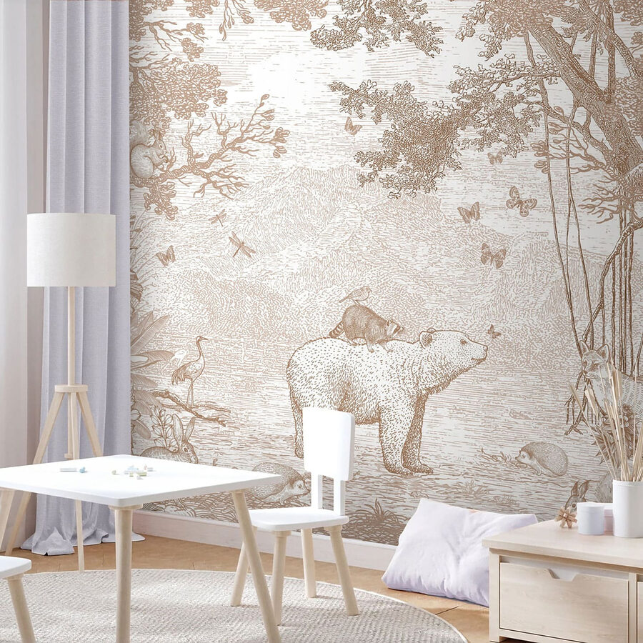 Wyobraź to sobie: uroczy szop pracz siedzący szczęśliwie na grzbiecie niedźwiedzia, otoczony przez leśnych przyjaciół. Ta fototapeta ścienna, idealna do każdego pokoju dziecięcego, wygląda jak strona prosto z czarującej książki z bajkami. Stonowane, sepiowe odcienie nadają jej ponadczasowy charakter, czyniąc ją kojącą i zachęcającą – niczym delikatny uścisk dla oczu. Wywoła niekończące się opowieści na dobranoc i pobudza wyobraźnię. Wyobraź sobie, jak oczy Twojego dziecka rozświetlają się każdej nocy. Idealne tło do zabawy, drzemki i wszystkich przytulnych chwil pomiędzy. Urzekający, kapryśny i uroczy!