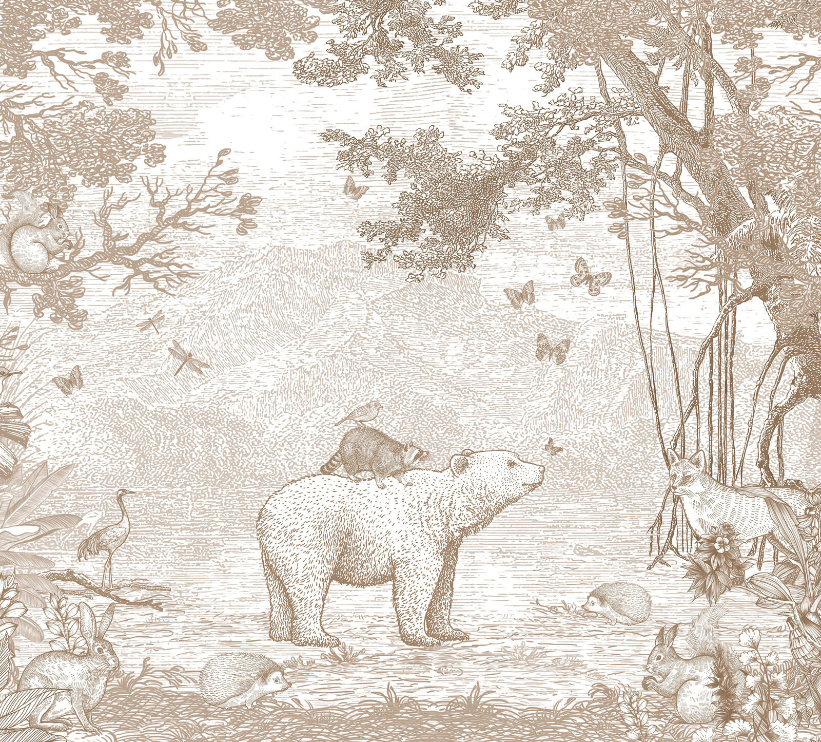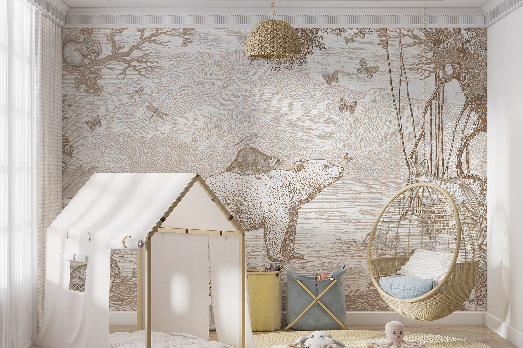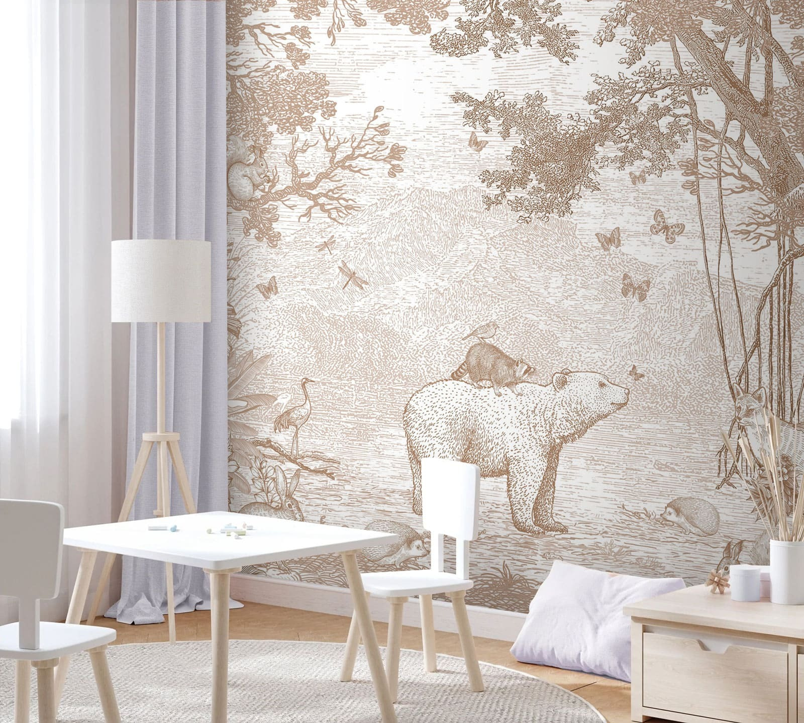 Wyobraź to sobie: uroczy szop pracz siedzący szczęśliwie na grzbiecie niedźwiedzia, otoczony przez leśnych przyjaciół. Ta fototapeta ścienna, idealna do każdego pokoju dziecięcego, wygląda jak strona prosto z czarującej książki z bajkami. Stonowane, sepiowe odcienie nadają jej ponadczasowy charakter, czyniąc ją kojącą i zachęcającą – niczym delikatny uścisk dla oczu. Wywoła niekończące się opowieści na dobranoc i pobudza wyobraźnię. Wyobraź sobie, jak oczy Twojego dziecka rozświetlają się każdej nocy. Idealne tło do zabawy, drzemki i wszystkich przytulnych chwil pomiędzy. Urzekający, kapryśny i uroczy!