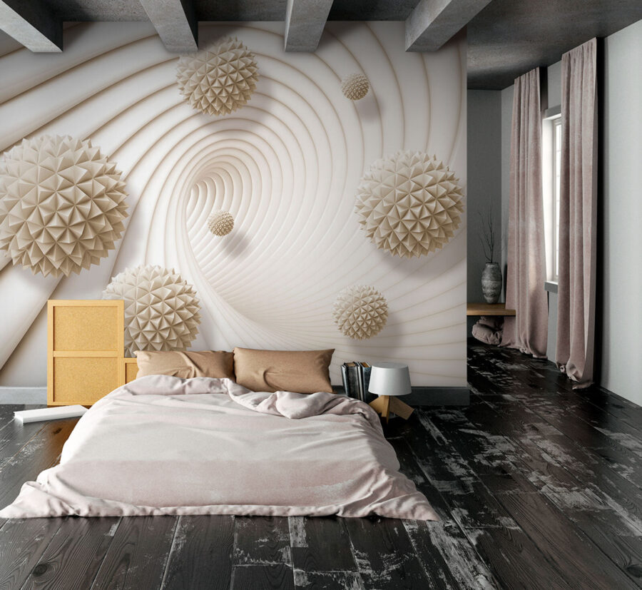 Wyobraź sobie, że wchodzisz do pokoju i czujesz się, jakbyś właśnie wszedł do eleganckiej, nowoczesnej galerii sztuki. Ta fototapeta, z abstrakcyjnymi białymi kulami pokrytymi trójkątami, natychmiast dodaje fajny efekt tunelu 3D do twojej przestrzeni. To jak zanurzenie się w futurystycznym wymiarze – bez opuszczania zacisza własnego domu. Połączenie geometrii i głębi sprawia, że każde pomieszczenie staje się nieco bardziej intrygujące. Jest to rodzaj projektu, który pobudza do rozmów, niezależnie od tego, czy wylegujesz się z dobrą książką, czy organizujesz niezobowiązujące spotkanie. Wystarczy odrobina awangardowego stylu, aby podnieść codzienny nastrój i zmienić nijakie ściany w fascynujący punkt.