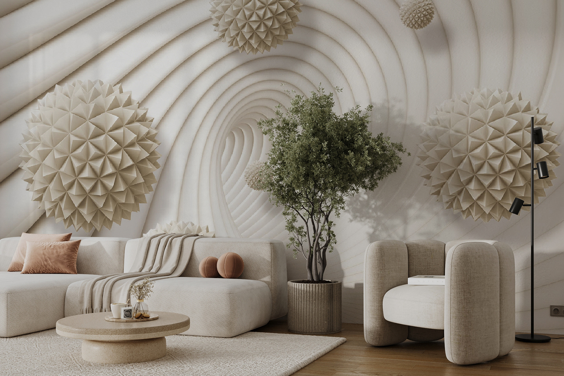 Wyobraź sobie, że wchodzisz do pokoju i czujesz się, jakbyś właśnie wszedł do eleganckiej, nowoczesnej galerii sztuki. Ta fototapeta, z abstrakcyjnymi białymi kulami pokrytymi trójkątami, natychmiast dodaje fajny efekt tunelu 3D do twojej przestrzeni. To jak zanurzenie się w futurystycznym wymiarze – bez opuszczania zacisza własnego domu. Połączenie geometrii i głębi sprawia, że każde pomieszczenie staje się nieco bardziej intrygujące. Jest to rodzaj projektu, który pobudza do rozmów, niezależnie od tego, czy wylegujesz się z dobrą książką, czy organizujesz niezobowiązujące spotkanie. Wystarczy odrobina awangardowego stylu, aby podnieść codzienny nastrój i zmienić nijakie ściany w fascynujący punkt.