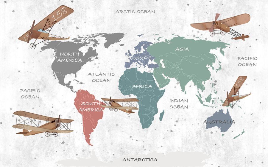 A te urocze małe samoloty? Niemal słychać ich szum, gdy przelatują nad kontynentami. Świetne do pobudzania wyobraźni przed snem. Ta urocza mapa nie tylko upiększa ściany; to brama do odkrywania odległych krain i snucia wielkich marzeń! Niezależnie od tego, czy chodzi o bajki na dobranoc, czy eskapady w czasie zabawy, ta fototapeta ma wyjątkowy charakter. Uroczy dodatek do pokoju każdej córki lub syna i szybki sposób na zostanie najfajniejszym rodzicem (nie żebyś już nim nie był). 🗺️❣️