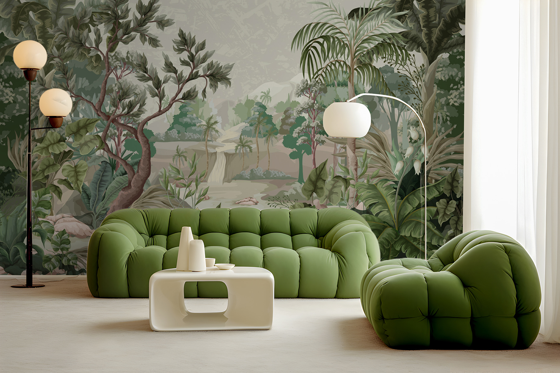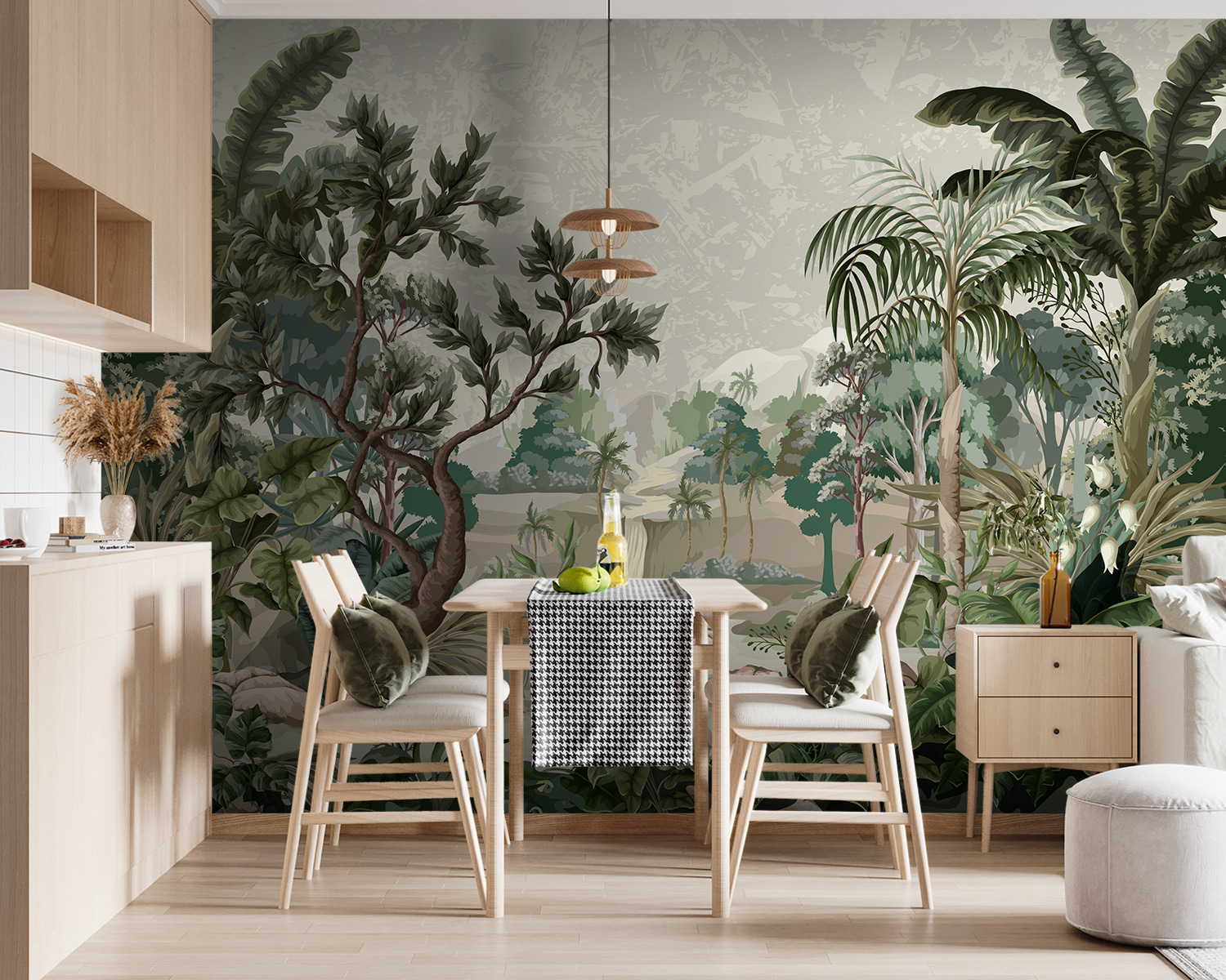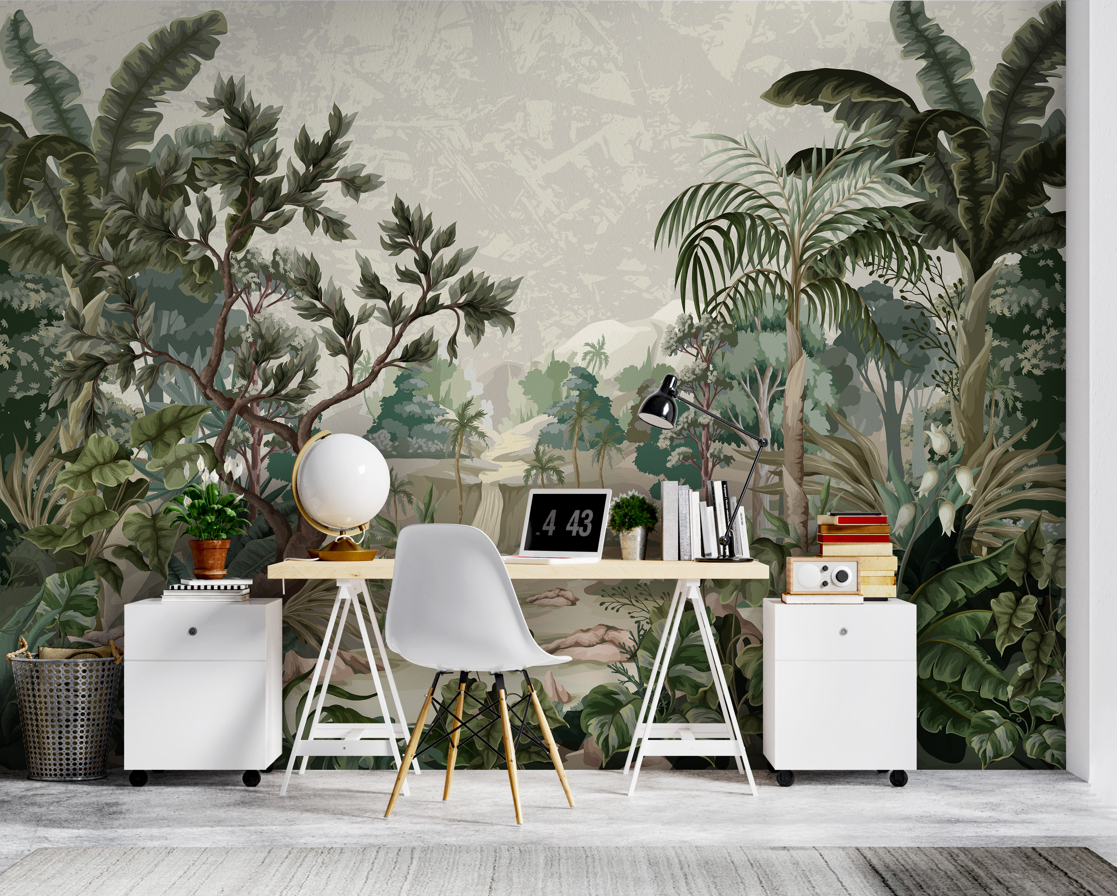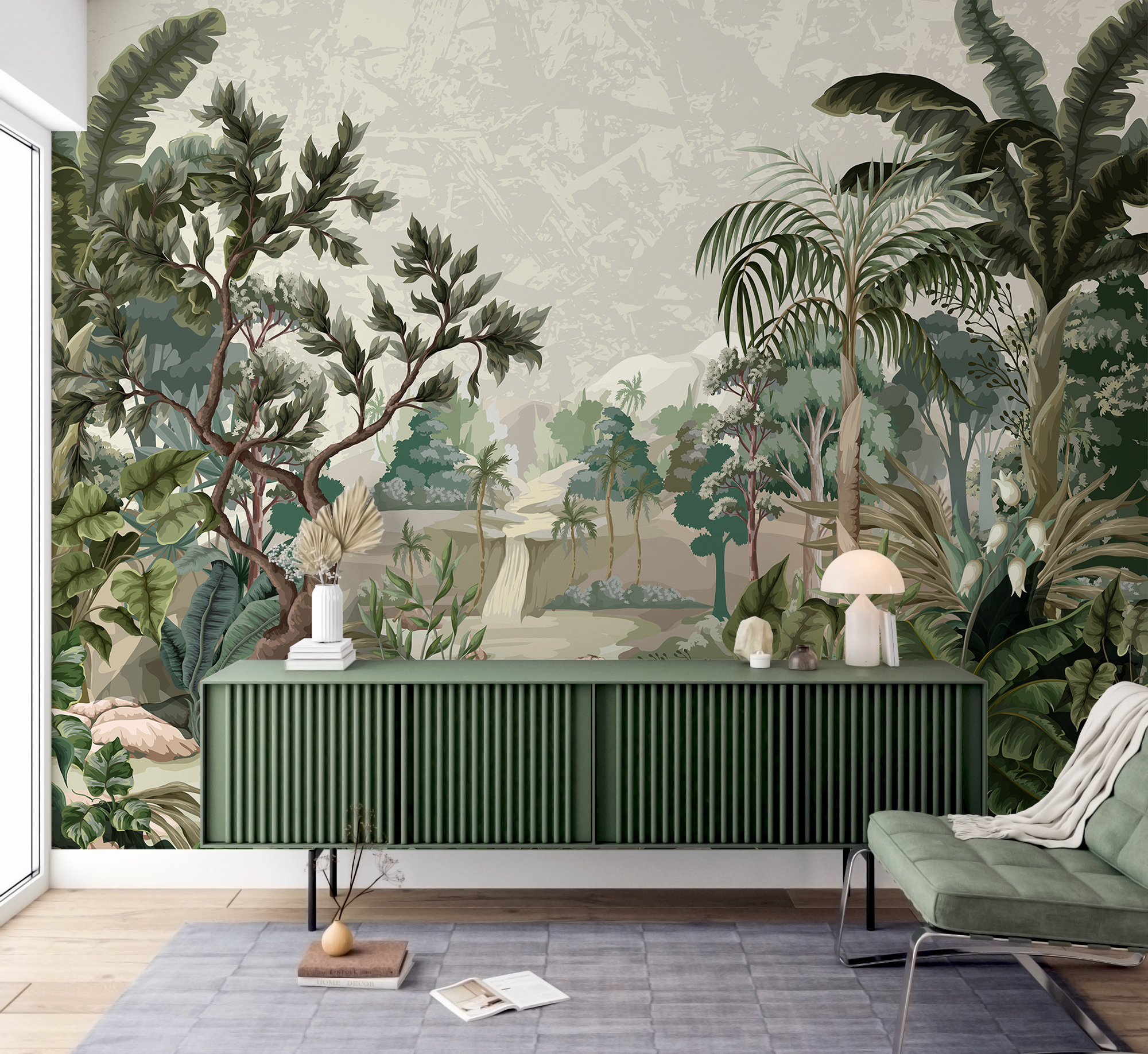 Czy kiedykolwiek chciałeś zamienić swój salon w uspokajającą oazę? Sprawdź tę fototapetę – to jak natychmiastowy, bujny tropikalny wypad. Bujna zieleń, wysokie drzewa i marzycielski wodospad. To jak wejście do magicznej dżungli, prosto z kanapy. Wyobraź sobie, że siadasz z poranną kawą i gubisz się w tym bogatym gobelinie liści i spokoju. To nie tylko fototapeta; to kawałek spokoju. Idealny dla każdego, kto pragnie odrobiny natury we wnętrzu. Zaufaj mi, nie przestaniesz się gapić.