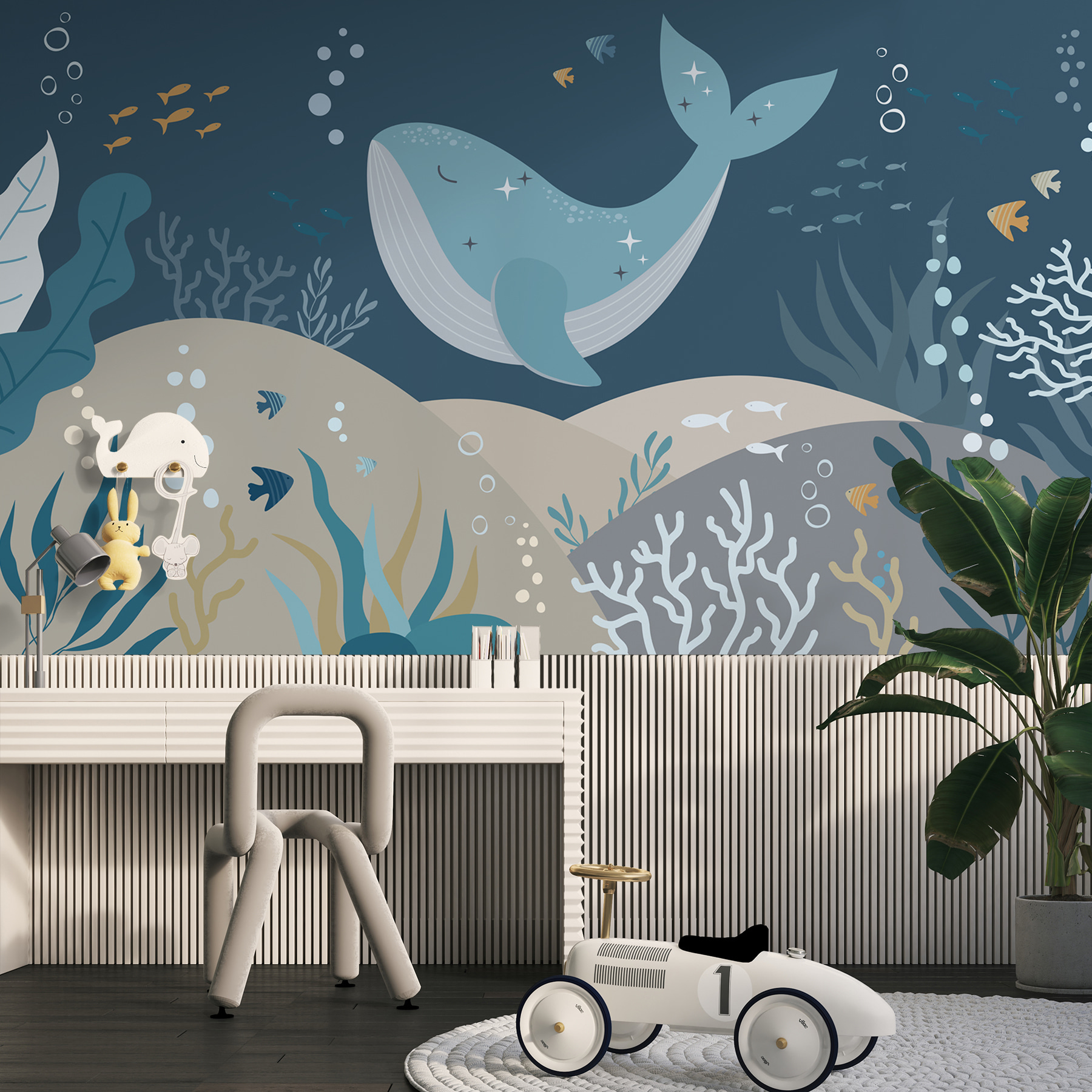 Zobacz tę kapryśną fototapetę “Niebieski wieloryb z gwiazdami i rybami”. Poważnie, to jak zanurzenie się w podwodnej krainie snów! Idealna do pokoju dziecięcego lub dziecięcego, wyobraź sobie delikatnie dryfującego niebieskiego wieloryba, posypanego migoczącymi gwiazdami, otoczonego zabawnymi rybami. Nie zdziw się, jeśli maluchy zgubią się w swoich własnych przygodach w oceanie. Miękkie niebieskie odcienie są jak spokojny uścisk – ah, kojące. Zmień porę snu w magiczną morską podróż każdej nocy dzięki tej czarującej fototapecie. To jak przeniesienie kawałka oceanu do swojego domu!