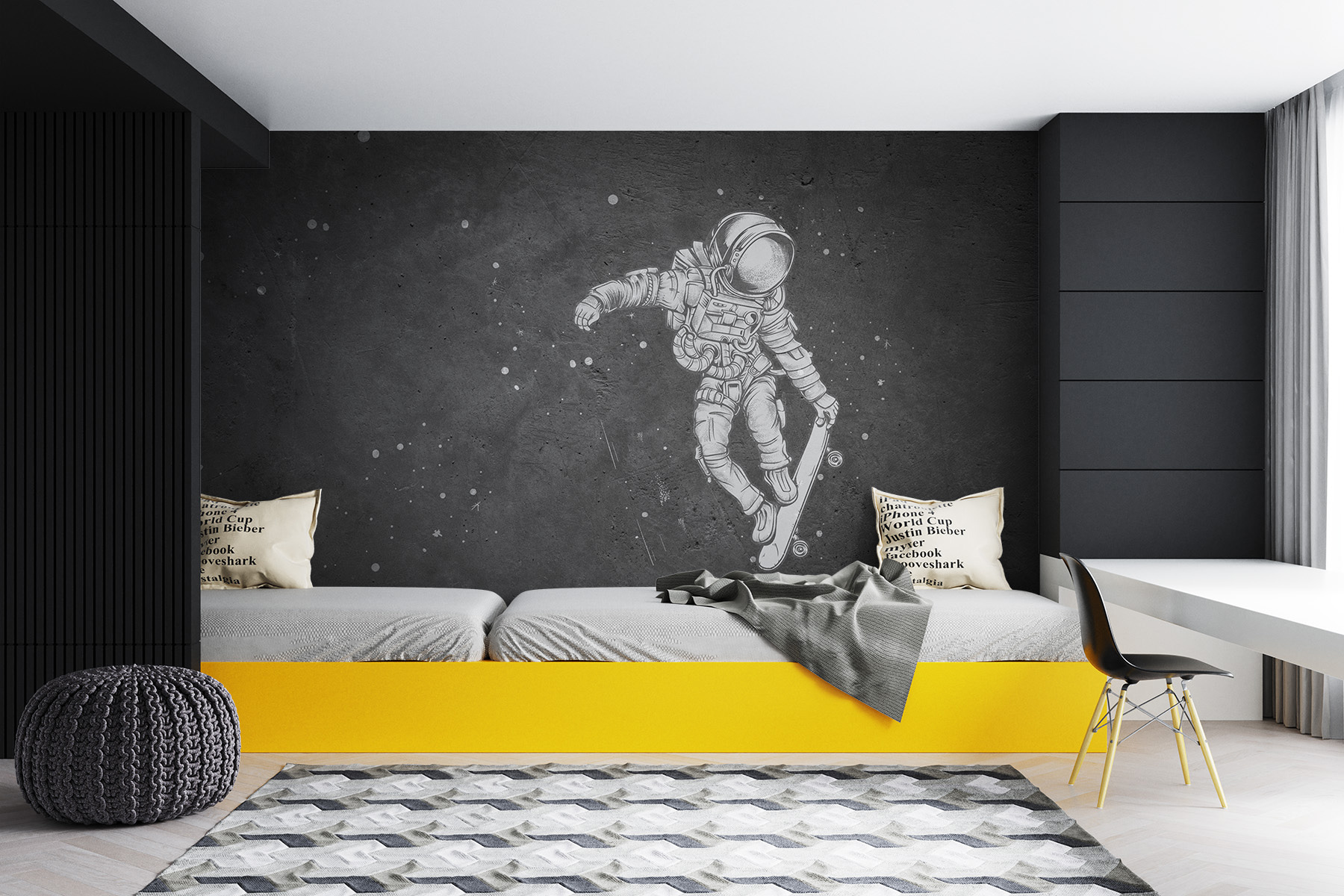 Odmień swoją przestrzeń dzięki tej dziwacznej fototapecie ściennej przedstawiającej astronautę bez wysiłku przemierzającego kosmos na deskorolce. To zabawny akcent, który pobudzi wyobraźnię każdego, przypominając nam, że życie powinno być tak pełne przygód, jak kosmiczna przejażdżka. Wyobraź sobie, że gościsz przyjaciół, a ich oczy rozszerzają się, gdy zauważają to wyjątkowe dzieło – z pewnością wywoła to rozmowy! Fototapeta łączy w sobie dreszczyk emocji związany z jazdą na deskorolce z cudem kosmosu, wprowadzając zabawną atmosferę, która jest zarówno chłodna, jak i kosmiczna. Idealna do pokoju dziecięcego lub dowolnej przestrzeni, która pragnie odrobiny chłodu!