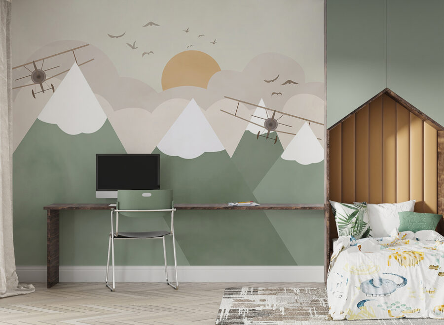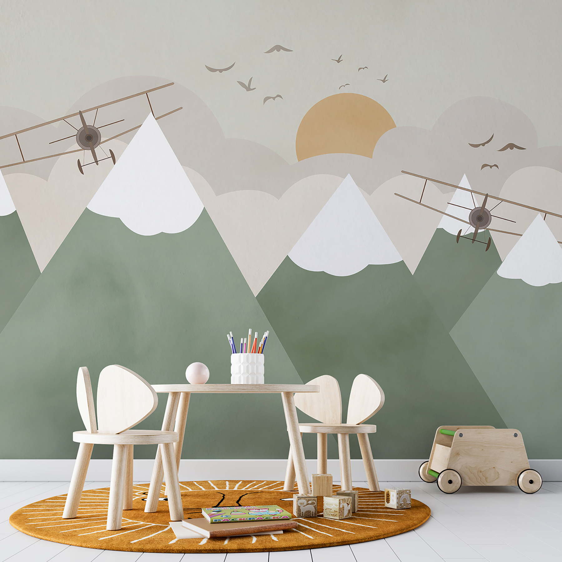 Przekształć każdy pokój w kapryśną przygodę dzięki tej uroczej fototapecie przedstawiającej dwupłatowce szybujące nad ośnieżonymi szczytami. Wyobraź to sobie: przytulny kącik, w którym maluchy mogą marzyć o wielkich przygodach, latając w chmurach i zdobywając góry wprost ze swojej sypialni. Miękkie kolory i delikatne linie sprawiają, że obraz jest jak ciepły uścisk, zapraszający wyobraźnię i tworzący spokojną atmosferę. Jest idealny do rozbudzania poczucia zachwytu podczas opowiadania historii lub zabawy. Kto wie, może nawet zainspiruje przyszłych pilotów! Wystarczy wyobrazić sobie historie, które mogłyby się tu rozwinąć. Idealna do pokoju dziecięcego lub pokoju zabaw, ta fototapeta wnosi odrobinę magii, która jest zarówno pełna przygód, jak i przytulna.