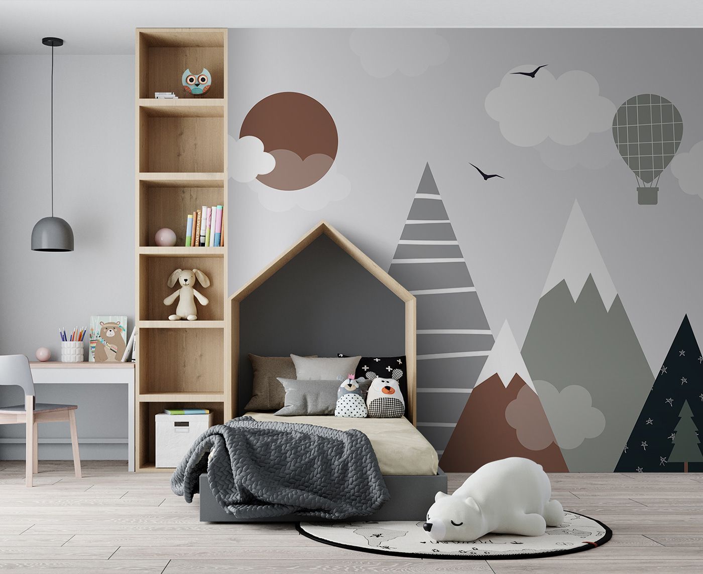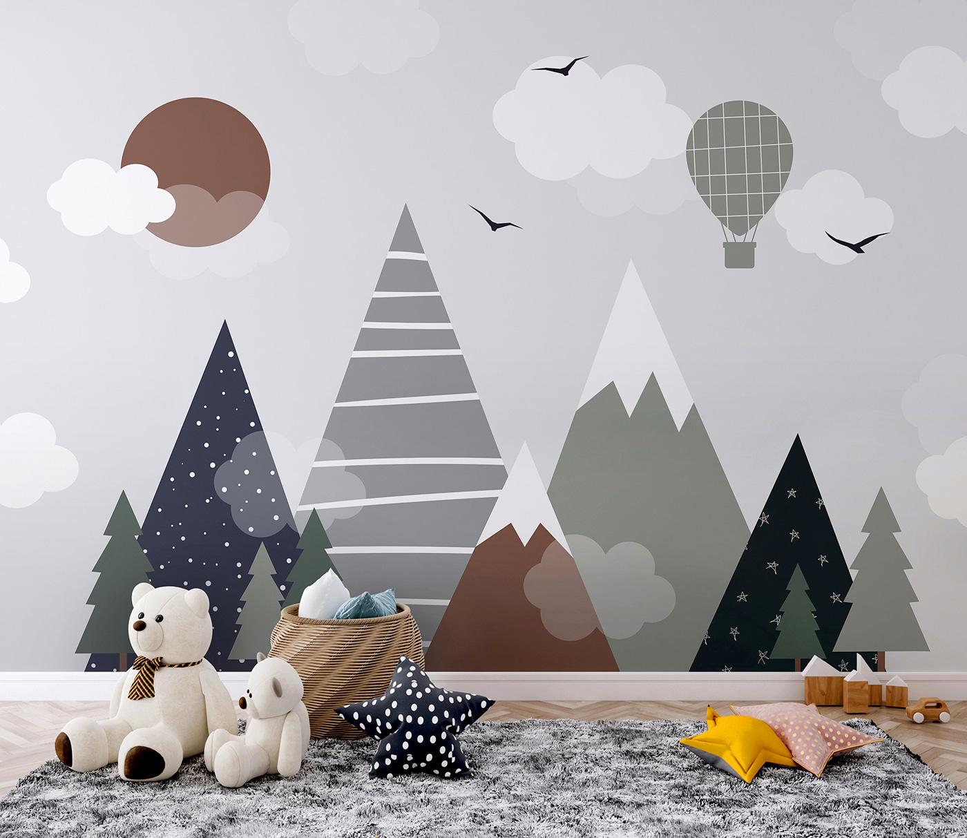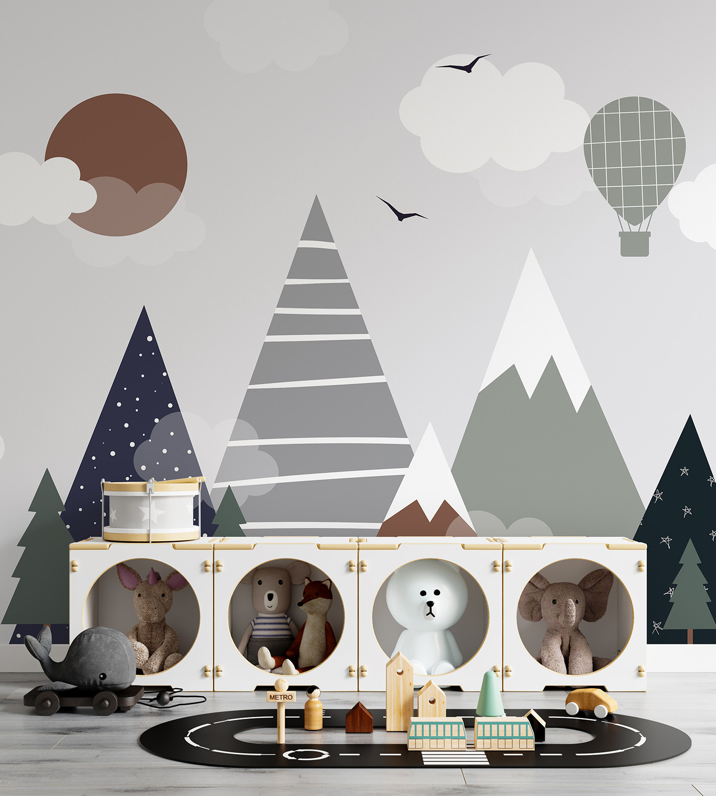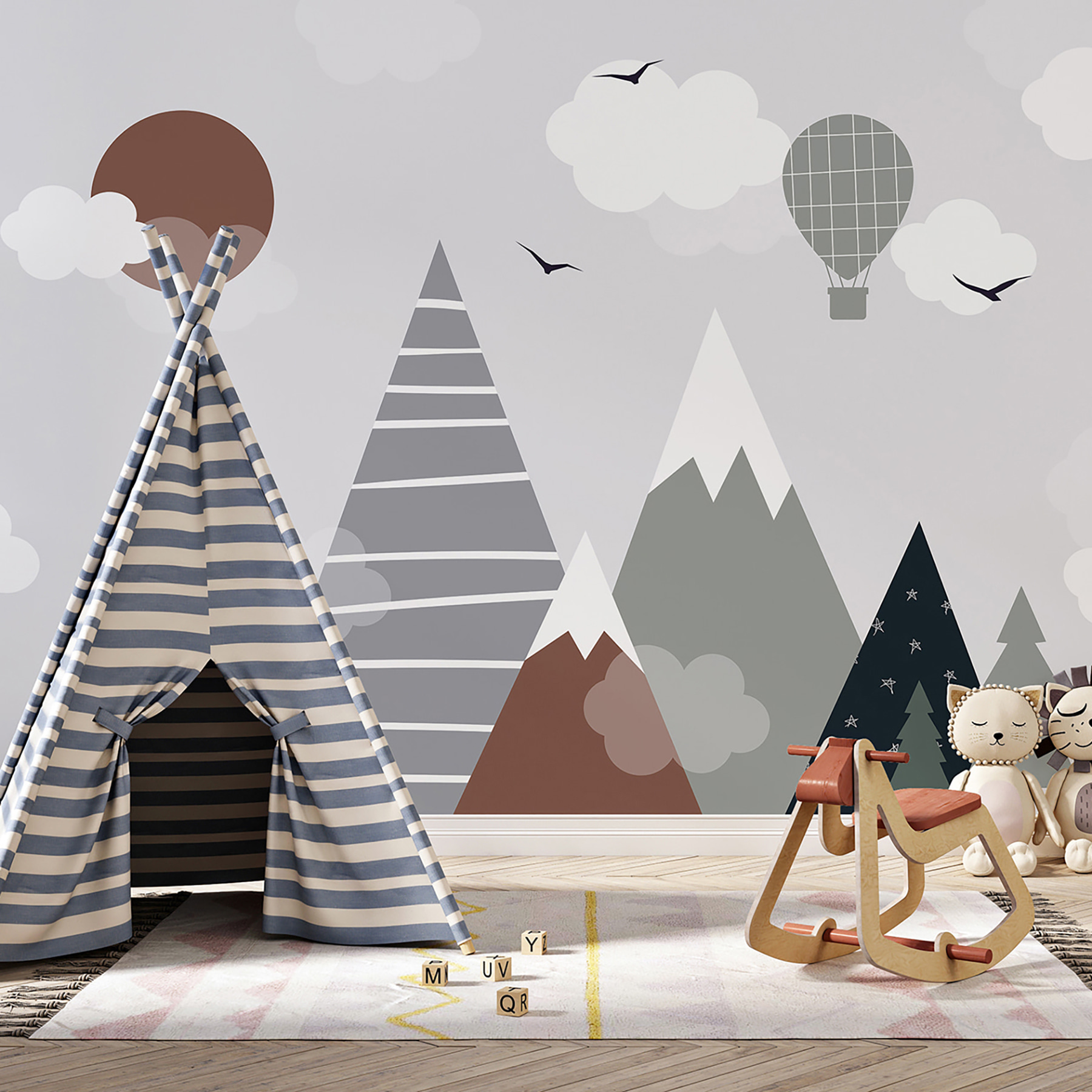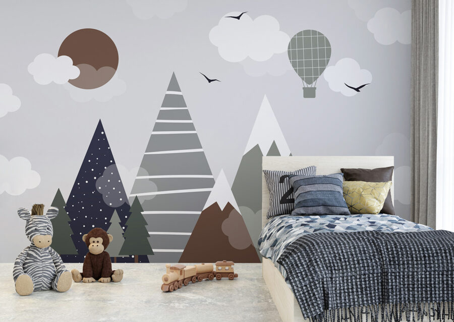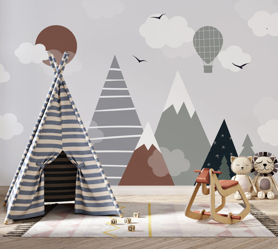 Sprawdź tę niesamowitą fototapetę – nazywa się “Brązowe koło z białymi chmurami”. Idealna do pokoju dziecięcego, zwłaszcza jeśli chcesz dodać odrobinę kaprysu do ich przestrzeni. Wyobraź sobie, że patrzysz w górę i widzisz tę zabawną scenę z górami, chmurami i balonem na ogrzane powietrze. To prawie jak wejście do bajki – całkiem magiczne, prawda?