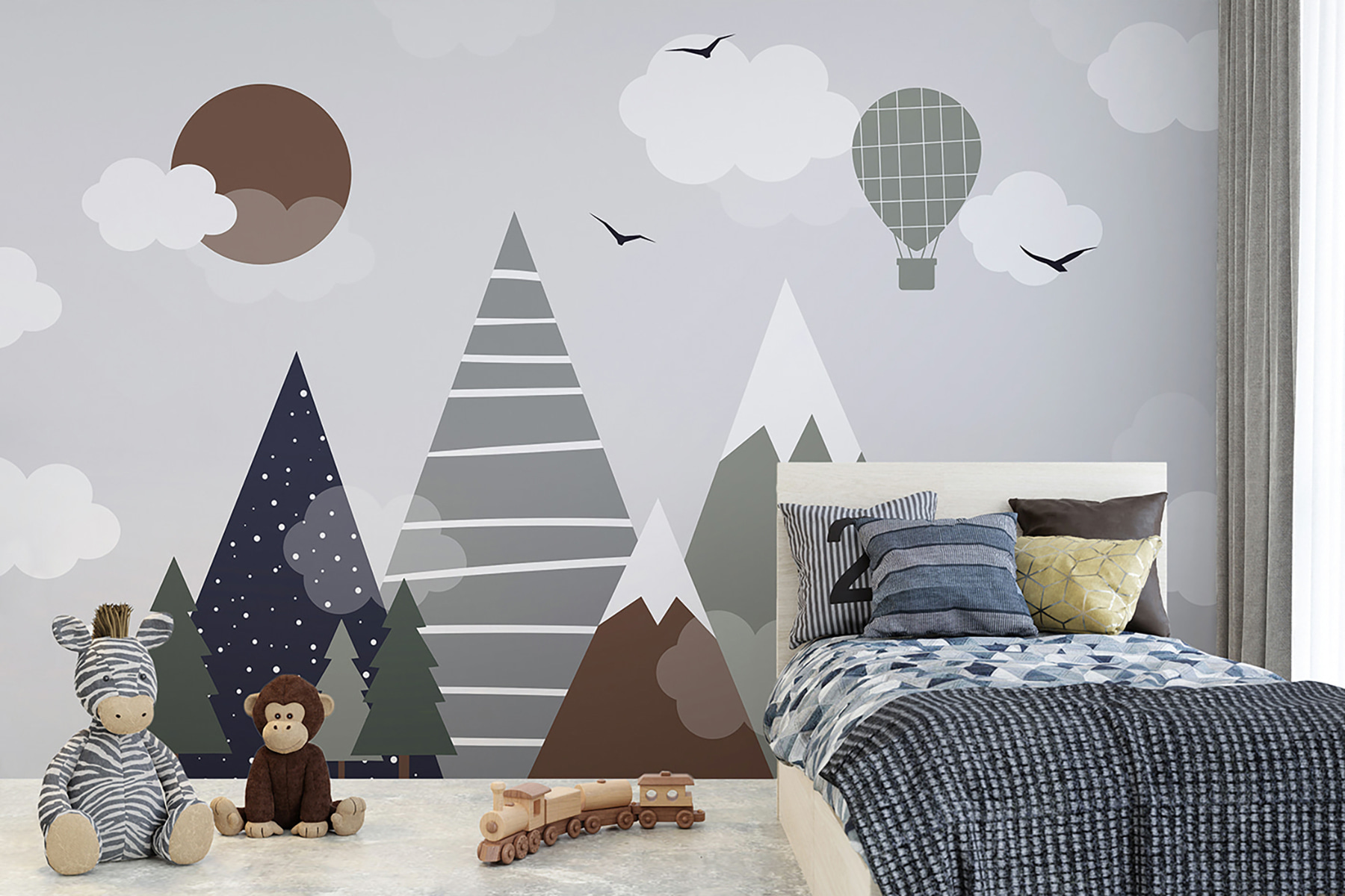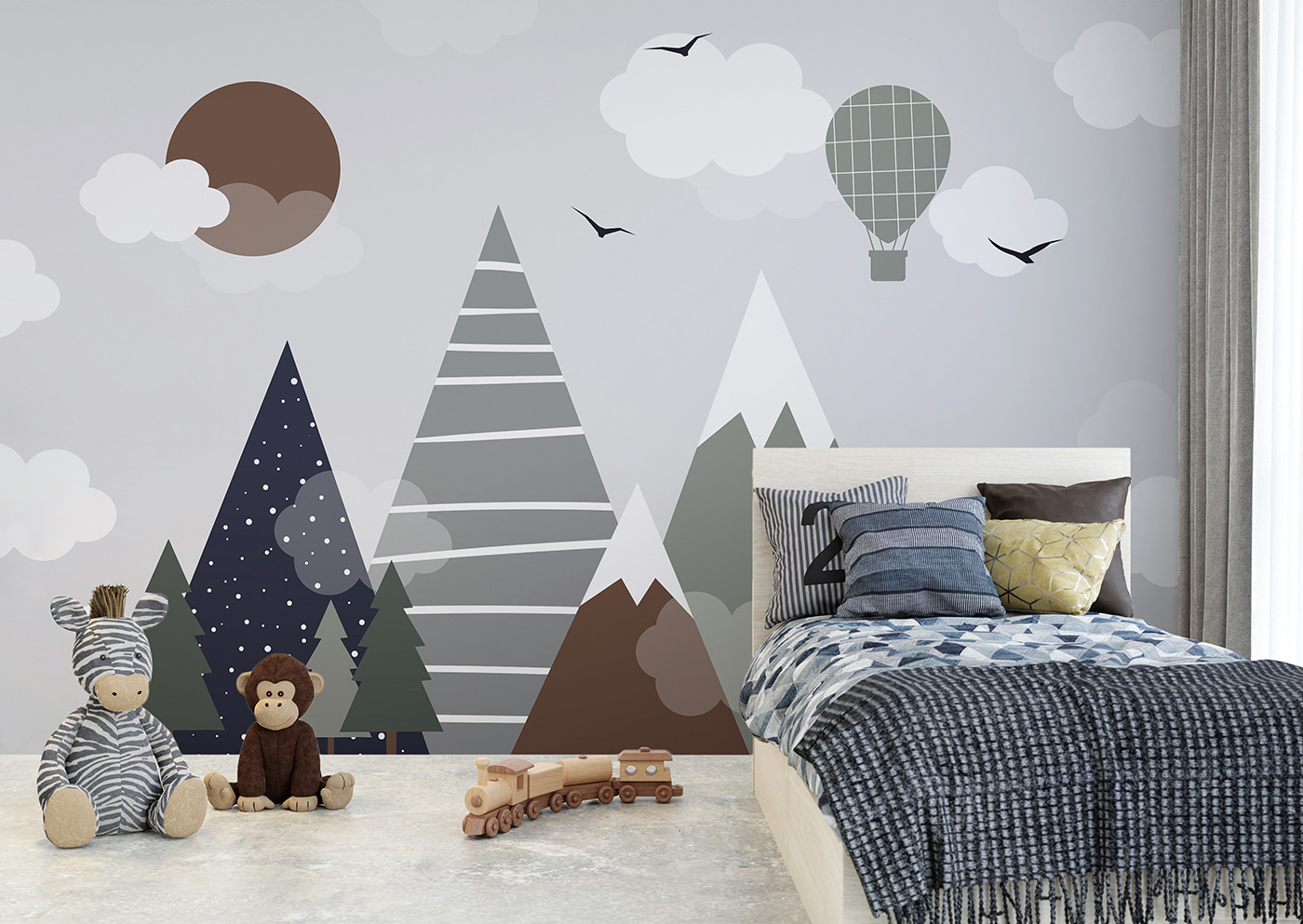 Ziemiste odcienie – kojące brązy i zielenie – mieszają się z kapryśnym designem, tworząc uspokajającą, ale pełną wyobraźni atmosferę. Czasami wystarczy tylko taka zabawna fototapeta, aby pokój stał się przytulny i ekscytujący.