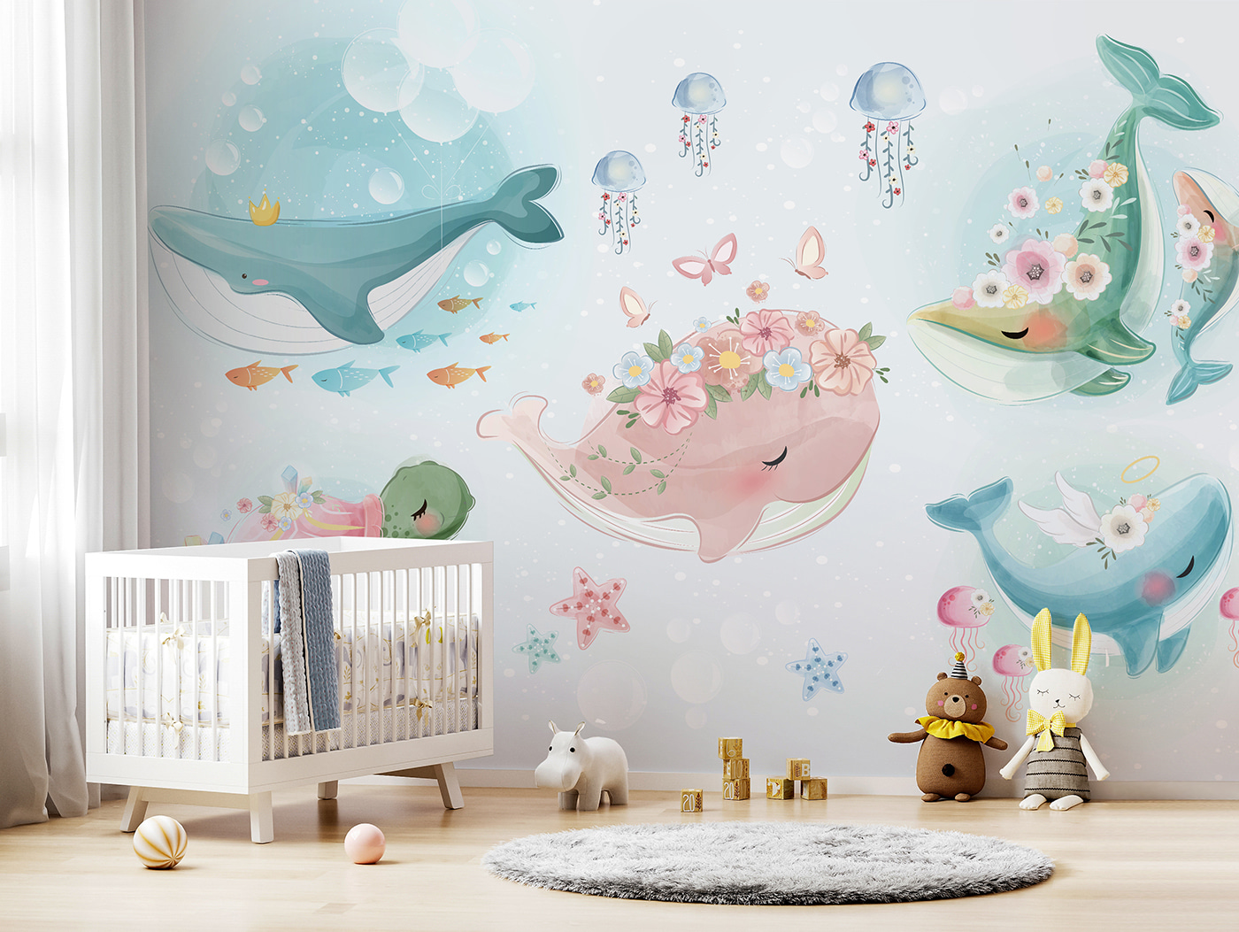 Wyobraź sobie dodanie odrobiny kaprysu do pokoju swojego malucha dzięki fototapecie “Różowy wieloryb z kwiatami na głowie”. Potrafisz to sobie wyobrazić? Ta czarująca fototapeta przedstawia uroczego, różowego wieloryba zwieńczonego delikatnymi kwiatami, unoszącego się wśród morza uroczych morskich przyjaciół – meduz, żółwi i nie tylko! To idealne miejsce na słodkie sny i oceaniczne przygody.