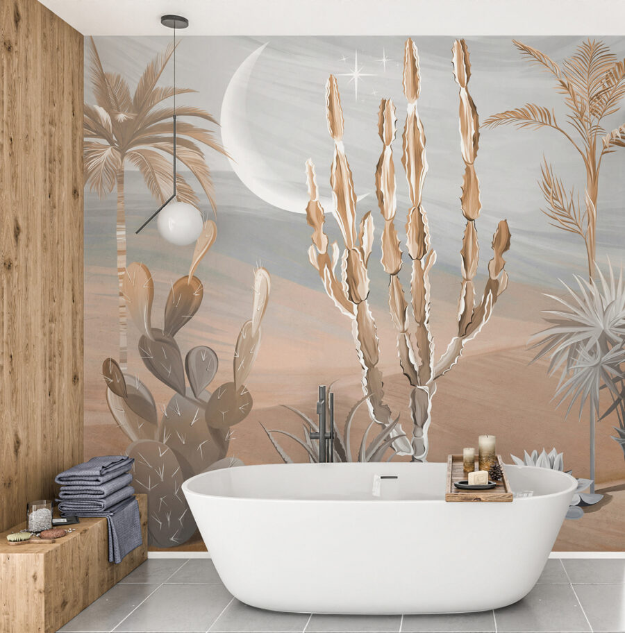 I szczerze mówiąc, kto nie potrzebuje odrobiny pustynnego zen w swoim życiu? Niezależnie od tego, czy jesteś fanatykiem kaktusów, czy po prostu chcesz odrobiny tropików, ta fototapeta to strzał w dziesiątkę. Więc śmiało, przekształć swoją przestrzeń za pomocą wietrznych pustynnych wibracji! 🌵🕌