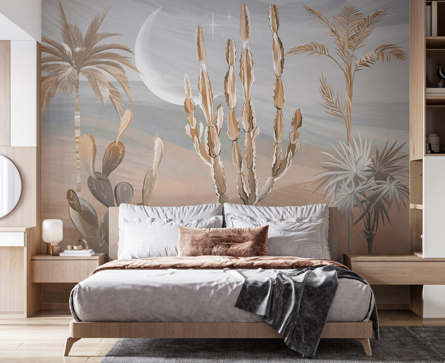 Zobacz ten niesamowity mural! Wyobraź sobie, że przenosisz kawałek pustyni prosto do swojego salonu – kaktusy, palmy i ten marzycielski krajobraz. To jak wejście do spokojnej oazy bez palącego upału i kłujących roślin. Idealny do dodania odrobiny wędrówki do każdej przestrzeni.