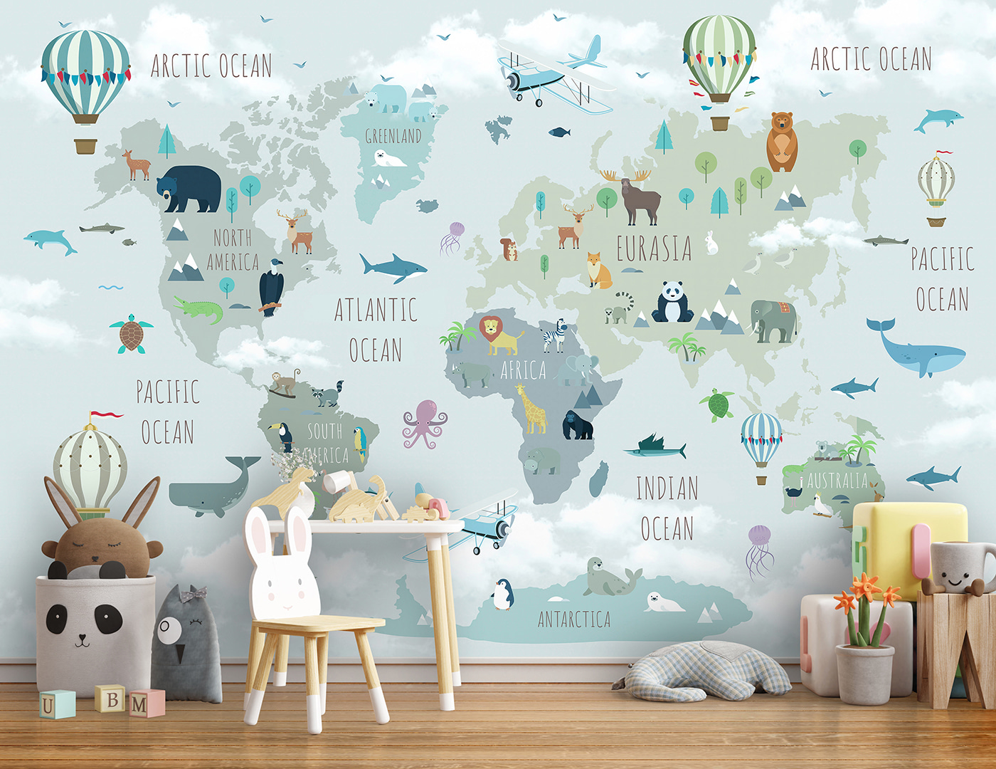 Delikatne, zabawne kolory i urocze ilustracje z pewnością przyciągną uwagę każdego. Idealne do snucia opowieści na dobranoc lub wyobrażania sobie wielkich wypraw przed szkołą. Jeśli więc szukasz magicznego akcentu, który odmieni pokój, ta fototapeta przeniesie świat cudów prosto na ścianę. Odpłyńmy, jedna flaga na raz. 🌍🚀✨