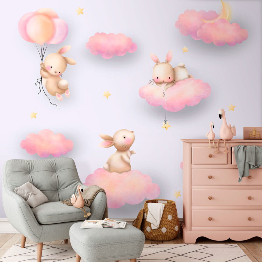 Wyobraź sobie, że pokój Twojego dziecka zmienia się w kapryśną krainę snów dzięki tej uroczej fototapecie z króliczkami z kreskówek! Te słodkie małe króliczki unoszą się na chmurach, trzymają sznurki i sięgają gwiazd – to jak scena z bajki na dobranoc! Idealna do pokoju dziecięcego – czy to dla syna, córki, czy po prostu, aby dodać odrobinę magii do każdej dziecięcej przestrzeni.
